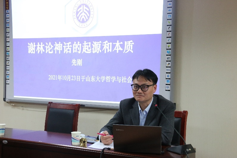 10月23日,北京大学先刚教授以“谢林论神话的起源和本质”为题做了学术报告,王丁副研究员主持,院长刘森林教授、哲学系冯波教授和梁乐睿副研究员参加了报告。