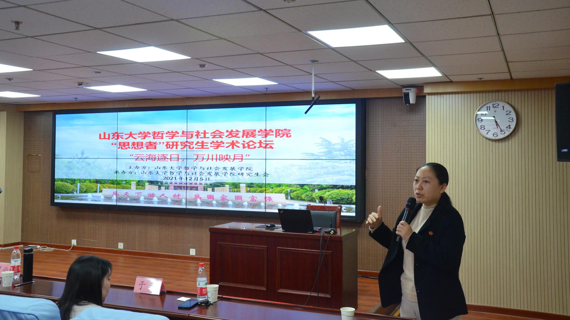 学院2021级社会学专业硕士生史艺姝主持论坛,共计30余名师生代表参加论坛。本次论坛以“云海逐日,万川映月”为主题,入选论文涵盖哲学、社会学、社会工作、社会保障等专业领域,部分优秀论文将在学院院刊《思想者》杂志上予以刊登。学院2020级马哲专业硕士生崔健民作题为《马克思对“洞穴喻”难题的克服——基于“实践”的视角》的报告,反思了苏格拉底式洞穴哲人的失败原因,进而说明了马克思如何通过“实践”让真正实现了的洞穴哲人在现代性社会语境中重生。2020级社会学专业硕士王骐龙利用CFPS数据,展示了互联网使用对户籍工资差距的影响。2021级社会工作专业硕士生张循铖基于自我决定理论视角和个案研究方法,作题为《老年人参与社区社会组织的动机和问题研究》的报告。刘姝杉从定性和定量两方面入手,借用福利三角理论,阐释了“996工作制”背后政府治理和市场效率的内在逻辑。2020级马哲专业硕士生刘冠呈作题为《虚无主义的唯名论基础——以施蒂纳为核心》的报告,区分了虚无主义的传统形而上学和审美两个维度,分析了施蒂纳对费尔巴哈的批判及马克思对虚无主义的态度。2020级社会学专业硕士生徐苑瑶基于PSCUS数据,总结了高等教育中的推免招生与人才选拔现状。2020级社会工作专业硕士生王振探讨分析了城镇居民人际信任与社会公平感知对政府信任的影响。2020级社会学专业硕士生李奇使用Stata分析了老年数字融入对心理健康的影响。2021级社会工作专业硕士生贾晓琼以叙事疗法为理论支撑,呈现了南充市X县X村失独老人临终关怀的社工介入。2020级社会工作专业硕士生逯阳阳采用问卷调查的方法,总结了乡村振兴背景下移风易俗政策贯彻执行状况,并提出相应对策建议。