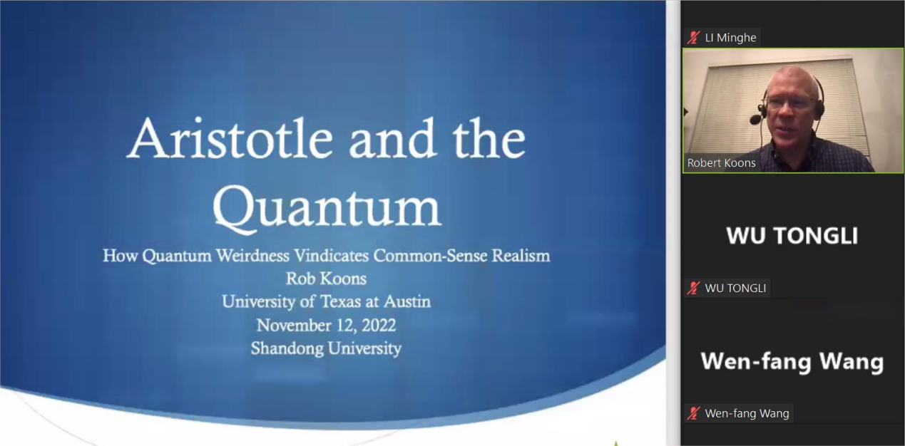 11月12日,德克萨斯大学的Robert C. Koons教授做客“望岳海外名家讲坛(第7期)”,给我院师生带来一场题为“How the Quantum Revolution Vindicates Aristotle’s Metaphysics(量子革命如何为亚里士多德的形而上学辩护)”的讲座。讲座由我院吴童立老师主持,Oleh Bondar老师评论。