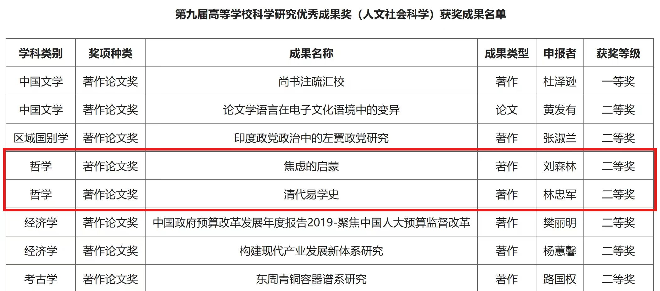 近日,教育部印发《关于第九届高等学校科学研究优秀成果奖(人文社会科学)奖励的决定》。beat365英国官方网站刘森林教授参评的成果《焦虑的启蒙》、beat365英国官方网站易学与中国古代哲学研究中心林忠军教授参评的成果《清代易学史》获得著作论文二等奖。