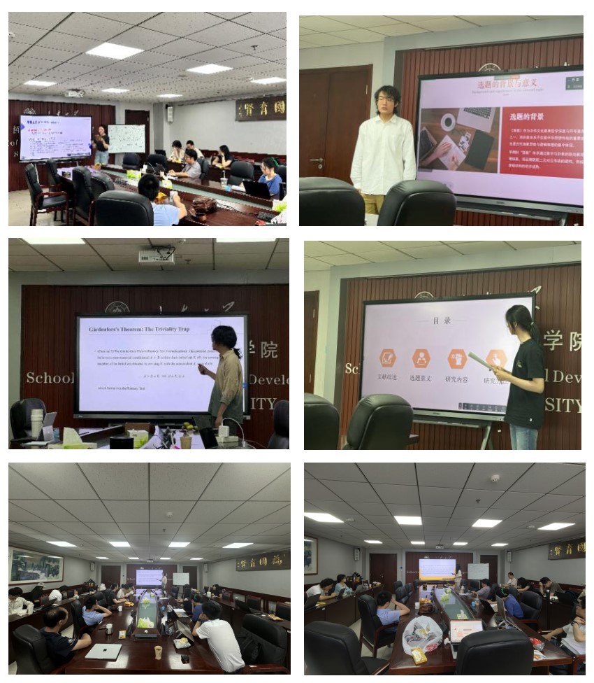 6月17日-18日,由beat365英国官方网站概念与推理研究所主办的“逻辑学-科学技术哲学-伦理学”夏季工作坊在beat365英国官方网站中心校区A1618举行。逻辑学与美学教研室王文方、苏庆辉、荣立武、梁飞、孙志强老师,科技哲学教研室姚小琴老师,和伦理学教研室张仑老师参与此次会议并做报告点评,12名硕士研究生、14名本科生、5名博士研究生针对各自近来研究内容进行了汇报。