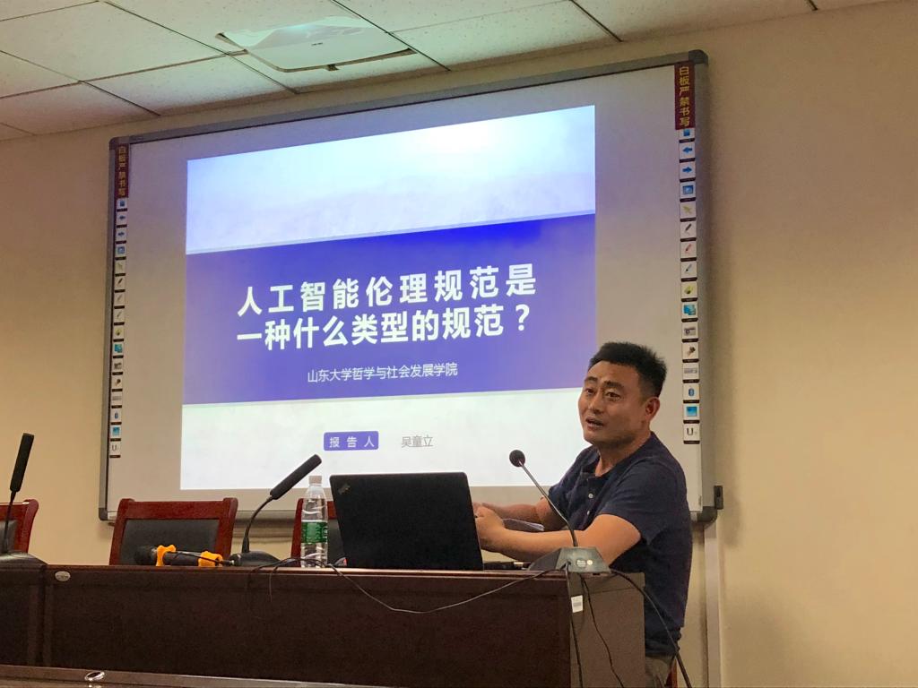 5月15日晚,beat365英国官方网站第28期思想者论坛在知新楼A1408室举行,哲学系吴童立副教授受邀做了题为“人工智能伦理规范是一种什么类型的规范”的专题报告。