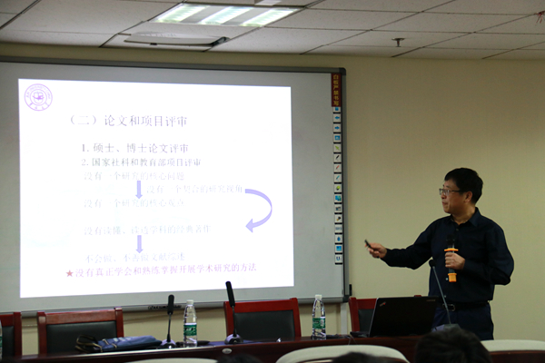 董才生教授首先介绍了选择这一主题的原因,即当下部分学者及学生未能学会并熟练掌握开展学术研究的方法,导致学术界存在着学术不端及在论文、项目研究中不规范的问题。他认为,在学术研究的基础方面,读透及读懂经典著作,了解学科研究的基本概念及理论是十分重要的。经典著作能触及到学科的本质问题,是“合逻辑之理”并达到“逻辑自洽”,能够经受时间考验,有助于提升学术研究的能力与水平。对于如何阅读经典著作,董教授指出,应带着“框架”,去“逐字逐句”地阅读。在阅读经典著作之后,要从“外在知识内在化”转化为“内在知识外在化”,从而达到知识的输出与应用。在解释时,理论思维应具有穿透力,即透过字面“显性”的含义去把握其背后“隐性”的深意。此外,同学们还应具备一定的概括能力与逻辑思维能力,避免出现过度诠释或诠释不足的问题。