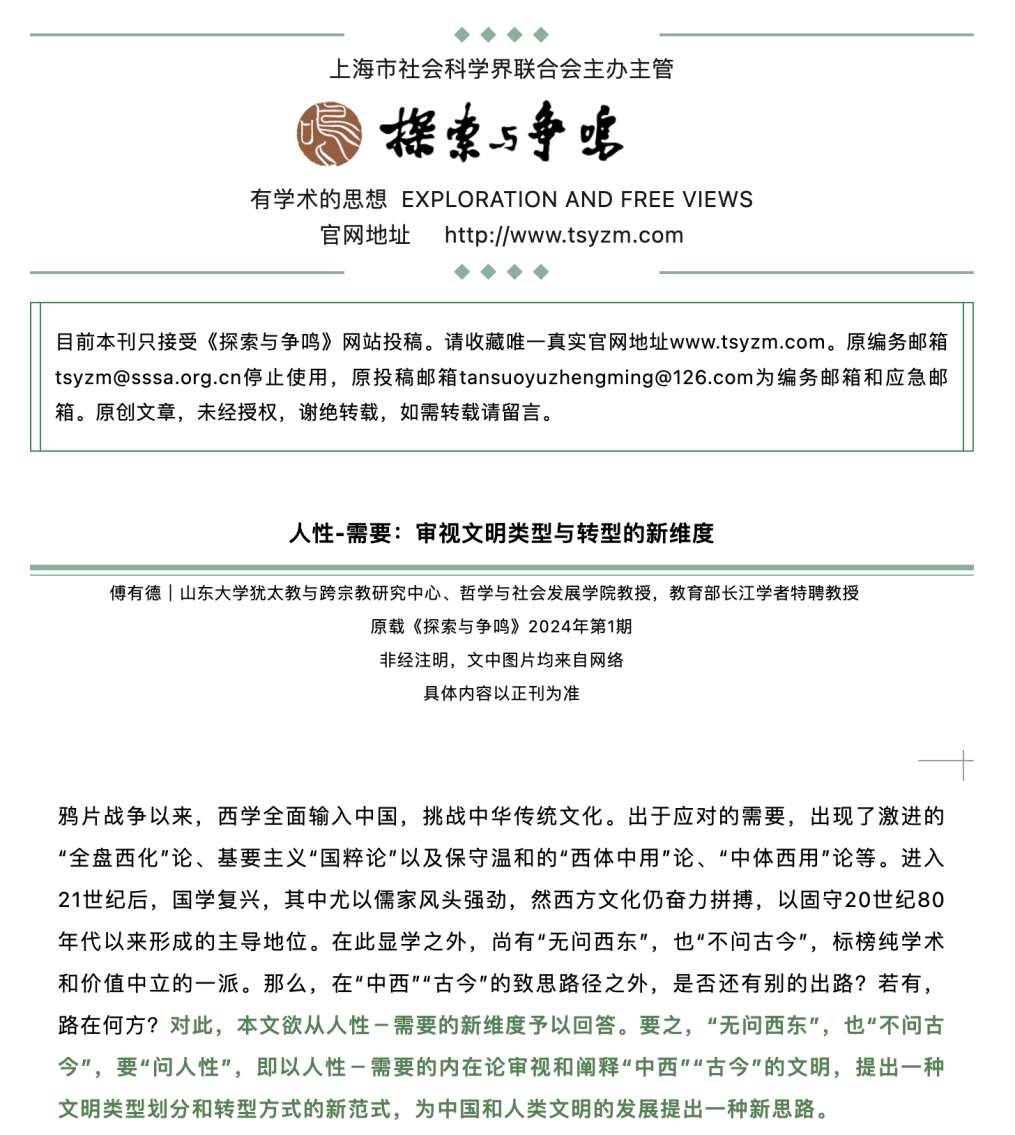 近日,beat365英国官方网站犹太教与跨宗教研究中心、beat365英国官方网站傅有德教授在《探索与争鸣》2024年第1期发表高质量论文《人性-需要:审视文明类型与转型的新维度》。