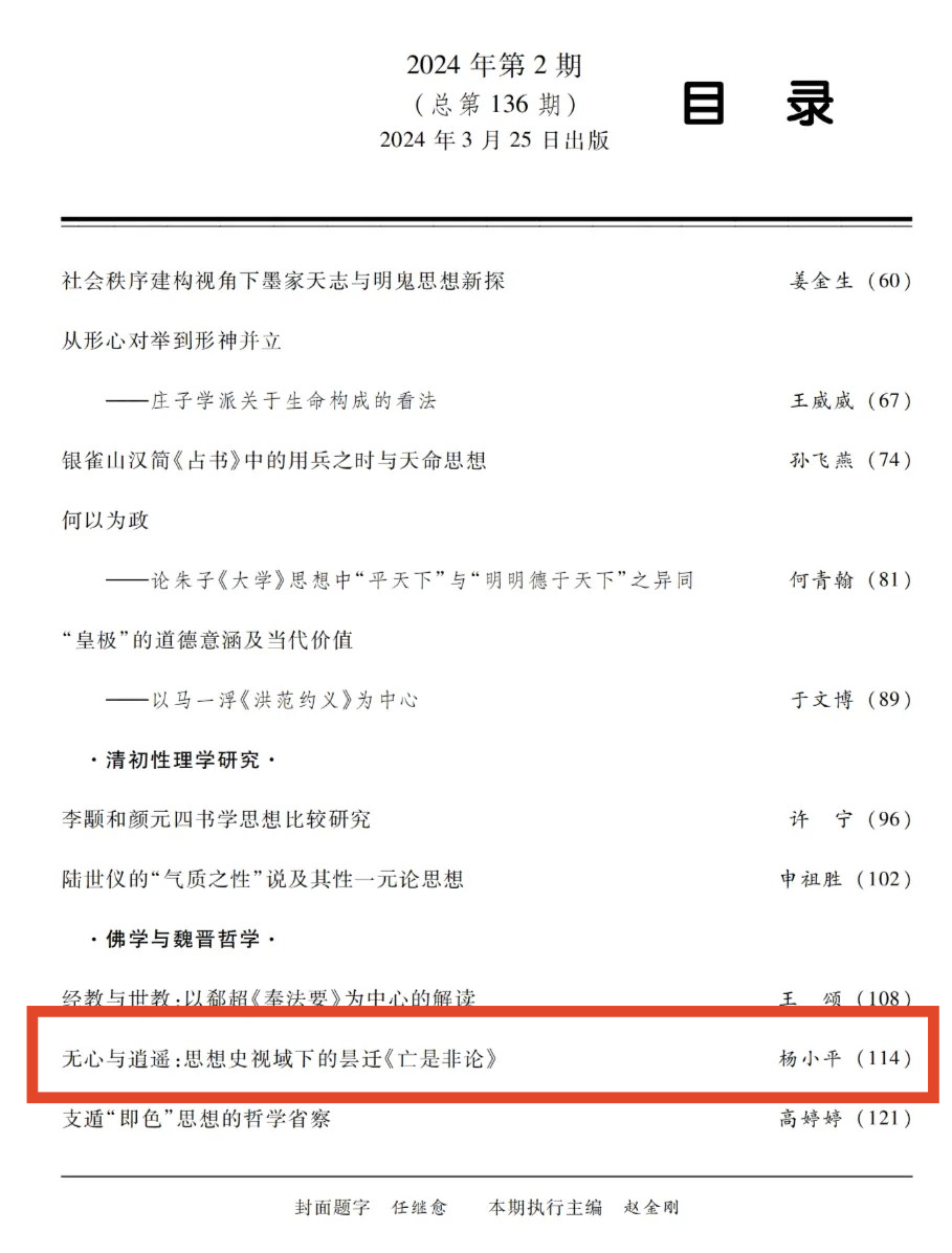 近日,beat365英国官方网站青年教师杨小平在《中国哲学史》2024年第2期上发表了题为《 无心与逍遥:思想史视域下的昙迁<亡是非论>》的高质量论文。