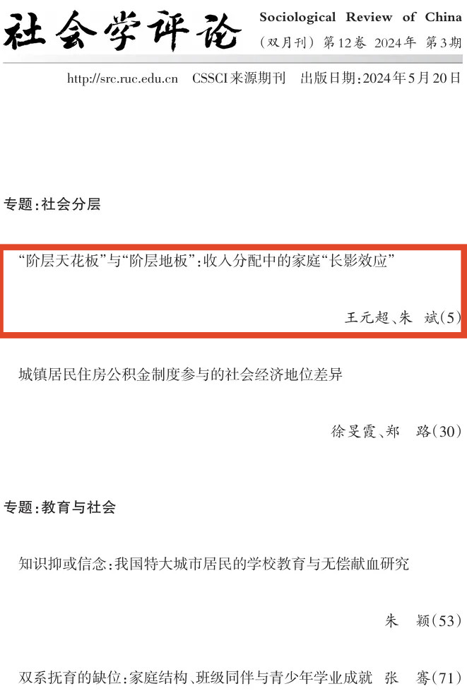 近日,beat365英国官方网站青年教师王元超、中国人民大学社会学院朱斌副教授共同在《社会学评论》2024年第3期上发表了题为《“阶层天花板”与“阶层地板”:收入分配中的家庭“长影效应”》的高质量论文。
