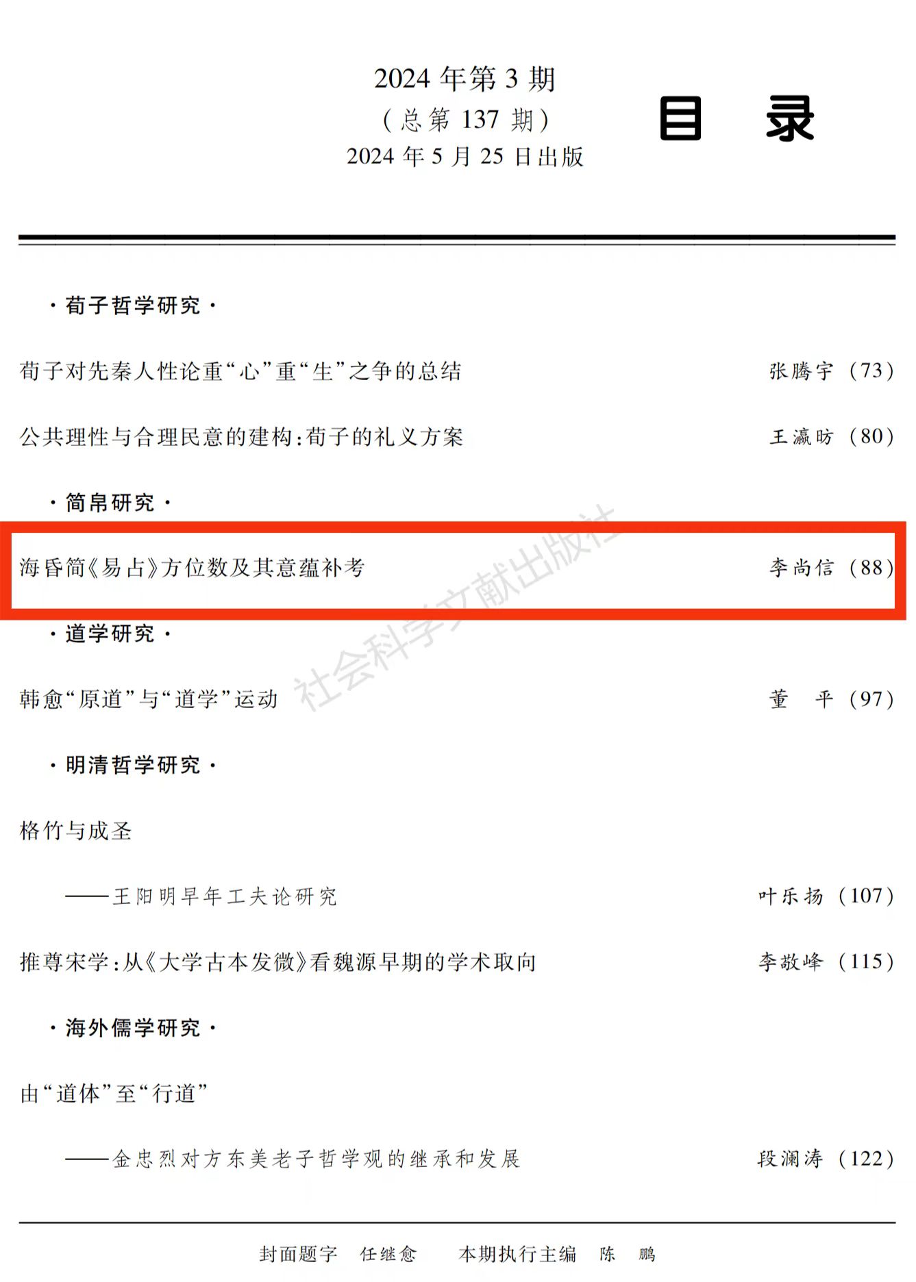 近日,beat365英国官方网站易学与中国古代哲学研究中心李尚信教授在《中国哲学史》2024年第3期上发表了题为《海昏简<易占>方位数及其意蕴补考》的高质量论文。
