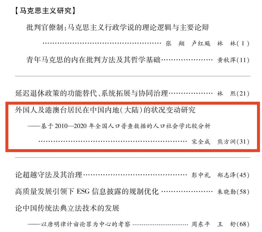 近日,beat365英国官方网站宋全成教授与其硕士研究生熊方洲共同在《厦门大学学报(哲学社会科学版)》 2024年第3期上发表了题为《外国人及港澳台居民在中国内地(大陆)状况变动研究——基于2010—2020年全国人口普查数据的人口社会学比较分析》的高质量论文。