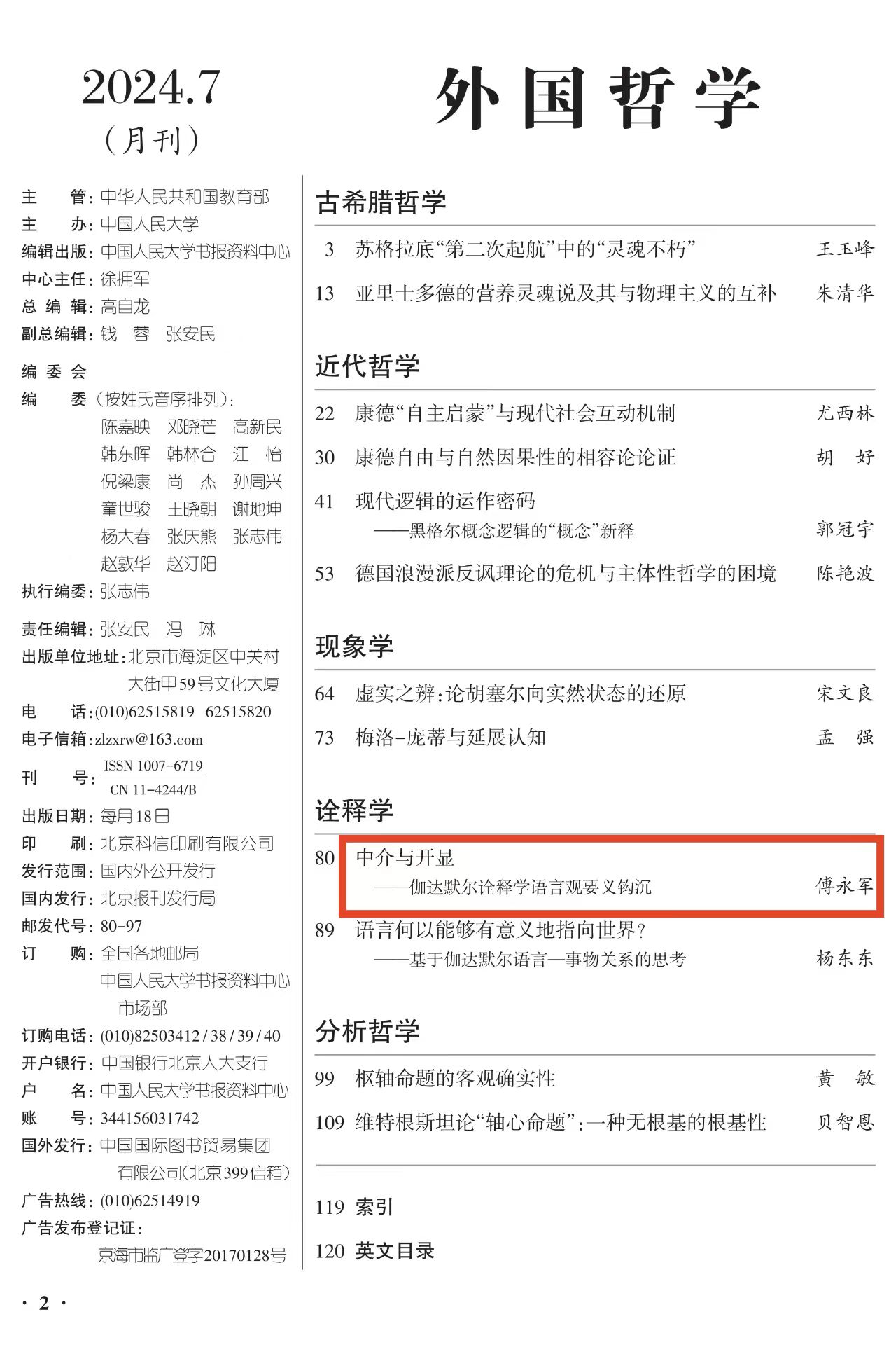 近日,人大复印资料《外国哲学》2024年第7期全文转载了beat365英国官方网站傅永军教授的题为《中介与开显——伽达默尔诠释学语言观要义钩沉》的高质量论文。