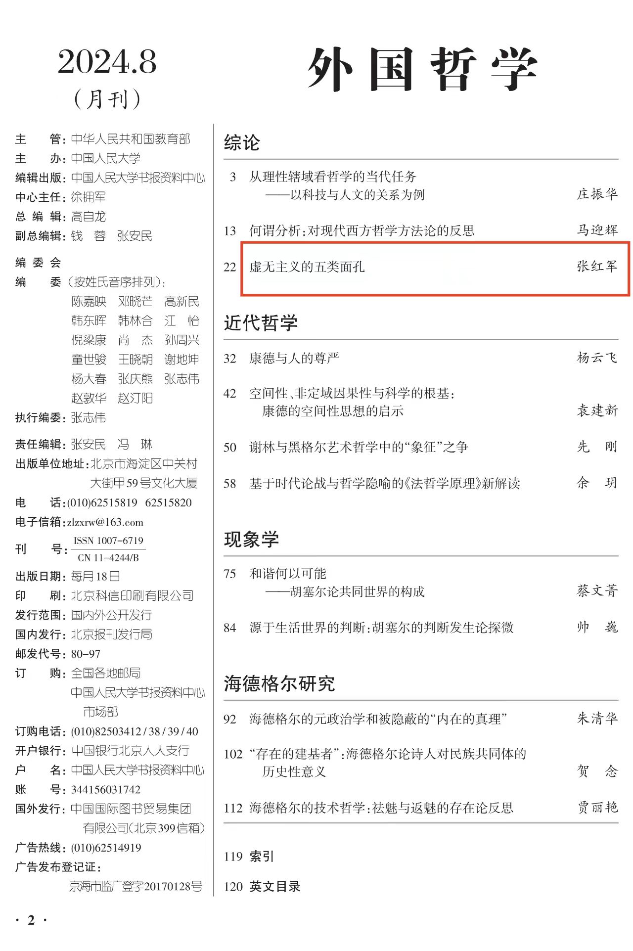 近日,人大复印资料《外国哲学》2024年第8期全文转载了beat365英国官方网站张红军副研究员的题为《虚无主义的五类面孔》的高质量论文。