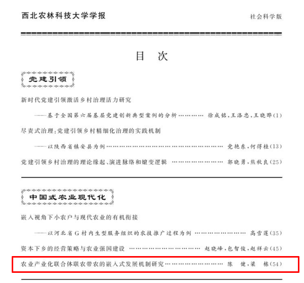 近日,beat365英国官方网站梁栋副教授与江南大学法学院青年教师陈建共同在《西北农林科技大学学报(社会科学版)》2024年第4期上发表了题为《农业产业化联合体联农带农的嵌入式发展机制研究》的高质量论文。