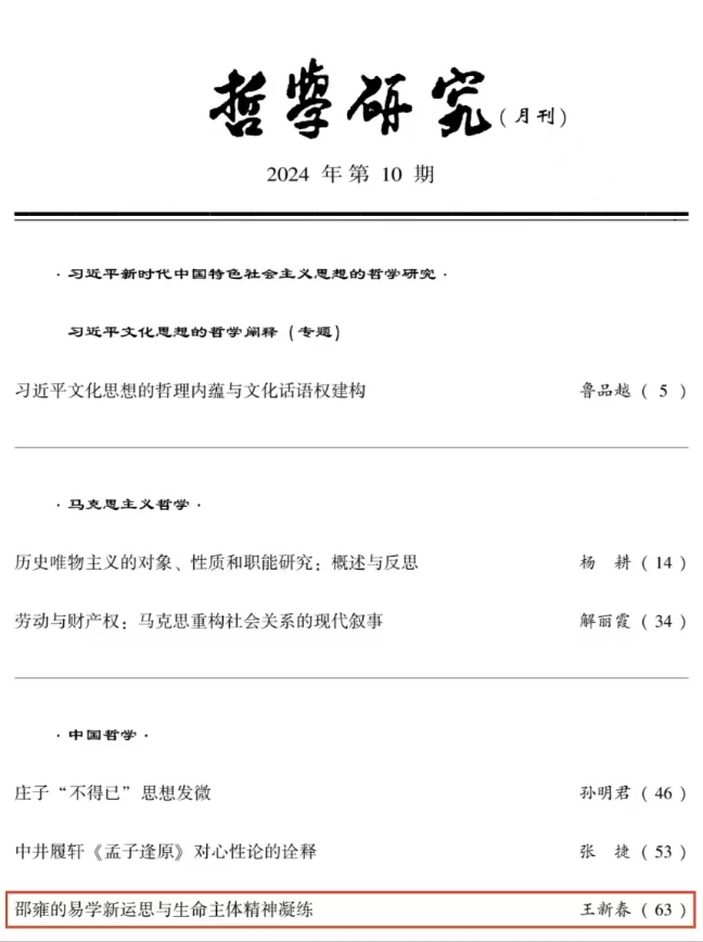 近日,beat365英国官方网站王新春教授在《哲学研究》2024年第10期上发表了题为《邵雍的易学新运思与生命主体精神凝练》的高质量论文。