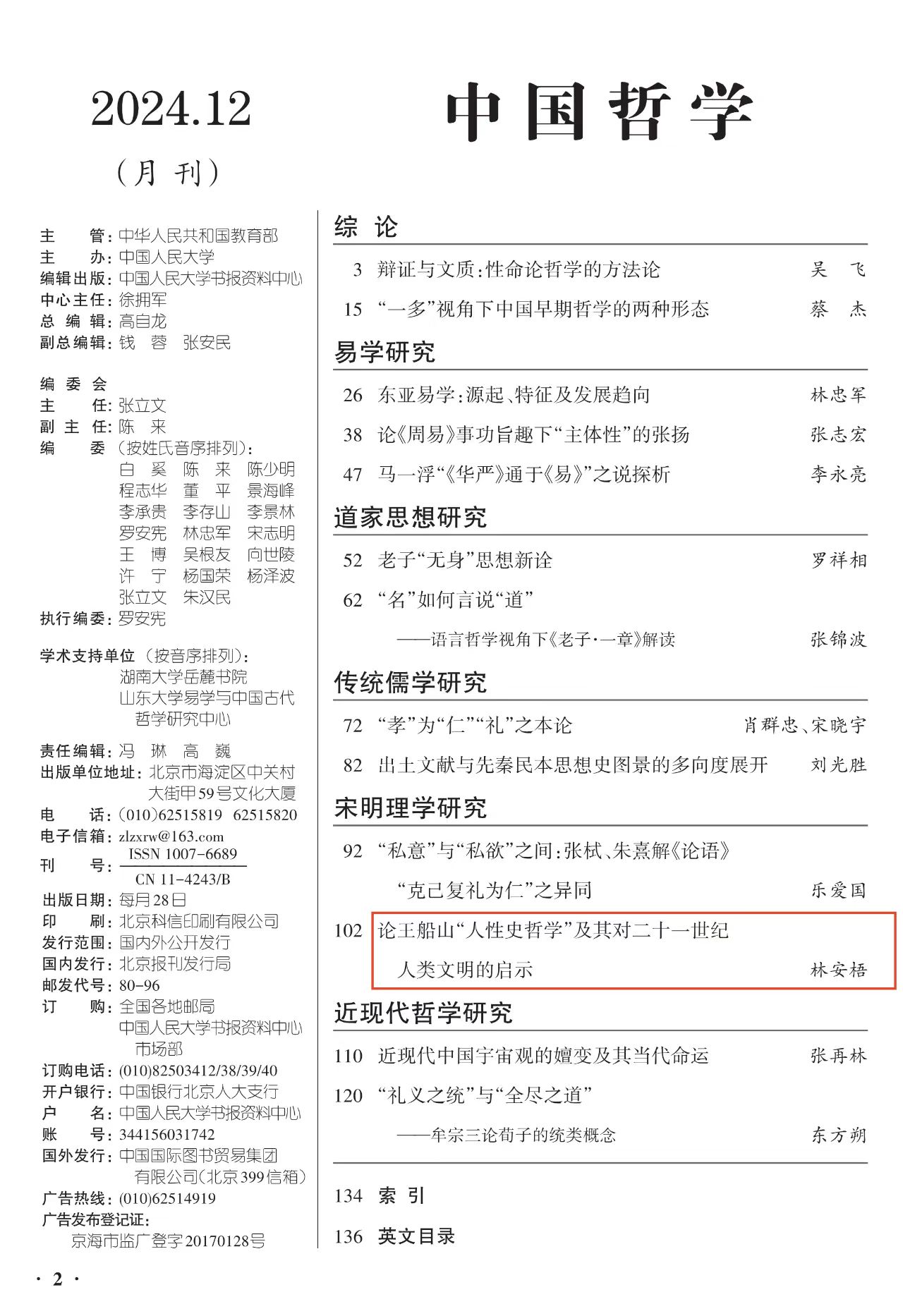 近日,人大复印资料《中国哲学》2024年第12期全文转载了beat365英国官方网站易学与中国古代哲学研究中心林安梧教授的题为《论王船山“人性史哲学”及其对二十一世纪人类文明的启示》的高质量论文。