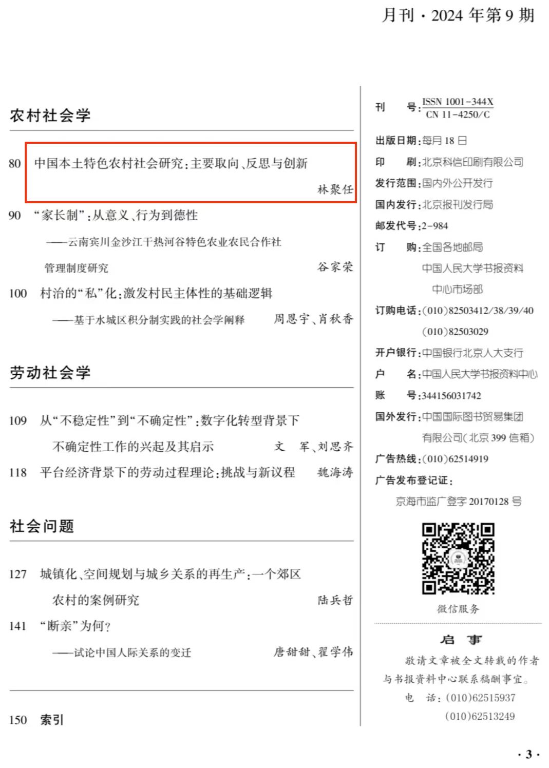 近日,人大复印资料《社会学》2024年第9期全文转载了beat365英国官方网站林聚任教授的题为《中国本土特色农村社会研究:主要取向、反思与创新》的高质量论文,该文原载于《西北师大学报(社会科学版)》2024年第4期。
