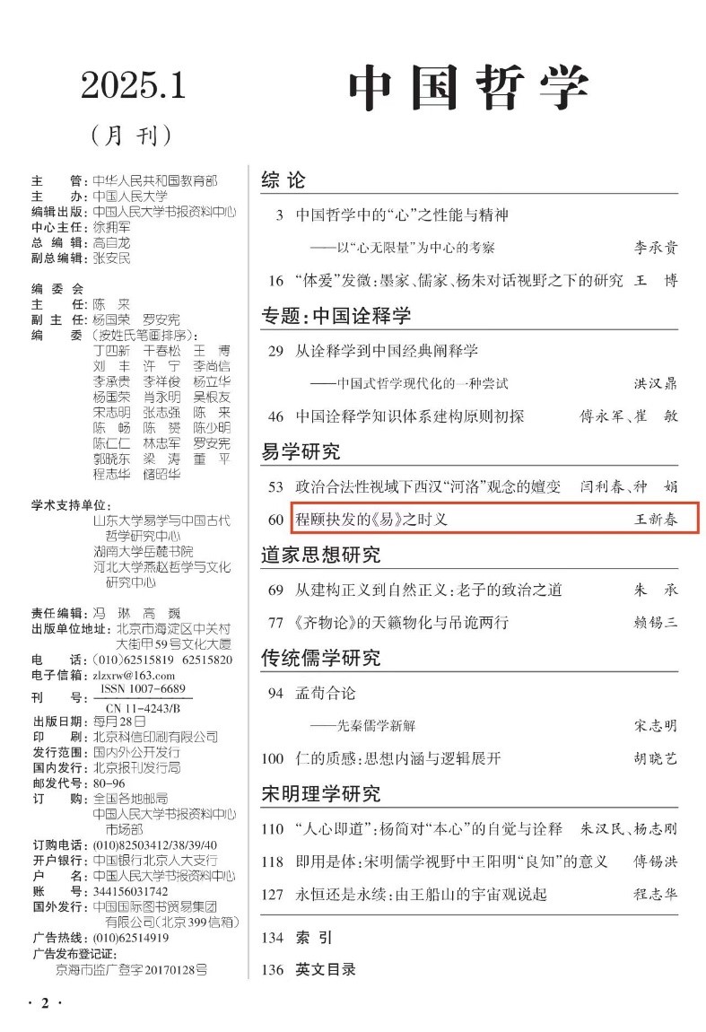 近日,人大复印资料《中国哲学》2025年第1期全文转载了beat365英国官方网站王新春教授的题为《程颐抉发的<易>之时义》的高质量论文,该文原载 于《周易研究》2024年第5期。