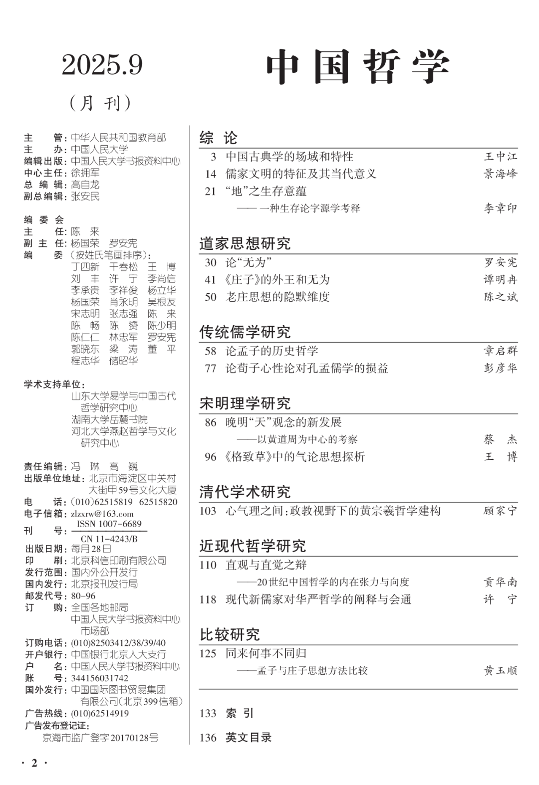 《中国哲学》为中国人民大学书报资料中心编辑出版刊物,精选中国古代哲学及史料学、中国哲学的特点及方法论、中国哲学的现代转化及中西哲学的比较等最新研究成果,旨在探讨先秦诸子学、两汉经学、魏晋玄学、宋明理学、明清实学、中西会通的近现代哲学,辨析儒释道三家在中国互相斗争及融合发展的历史,反映新世纪中国哲学的发展动向以及与中国社会现代化的关系,设有综论、易学研究、传统儒学研究、诸子学研究、宋明理学研究、道家思想研究、现代中国哲学研究等亮点栏目。