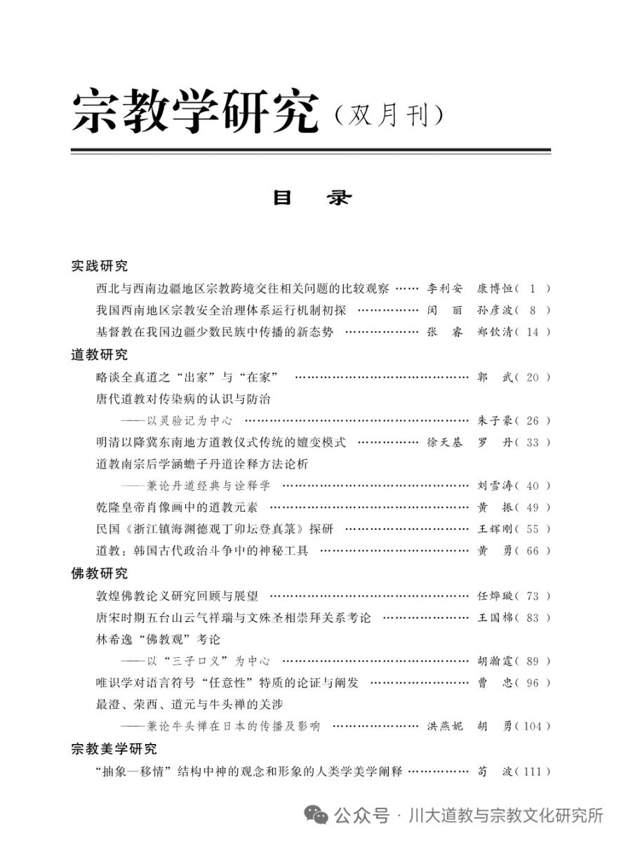 《宗教学研究》是四川大学道教与宗教文化研究所(宗教学研究所)主办的宗教学专业学术双月刊,创建于1982年8月,是全国高校中公开出版发行的唯一的宗教学专业学术期刊。该刊十分注意发掘和培养在宗教学研究领域里奋斗的年轻学者,是新时代构建马克思主义宗教学学科体系、话语体系以及培养宗教学研究队伍的重要阵地,系国家社会科学基金、四川省哲学社会科学基金资助期刊、CSSCI来源期刊、全国中文核心期刊、中国人文社会科学核心期刊。