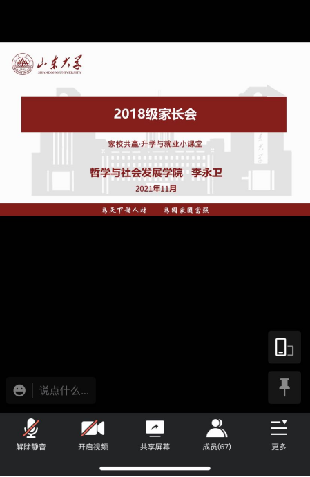 家长会的主题为:家校共赢——升学与就业小课堂。李永卫从历年来学院本科生就业升学状况、2018级本科生目前状态、目前遇到的问题以及给家长朋友们的建议四个方面展开,为家长详细介绍了有关毕业生的情况,并提供了详实的建议。家长会结束后,辅导员封莹针对家长的问题进行了答疑,与家长进行了交流。