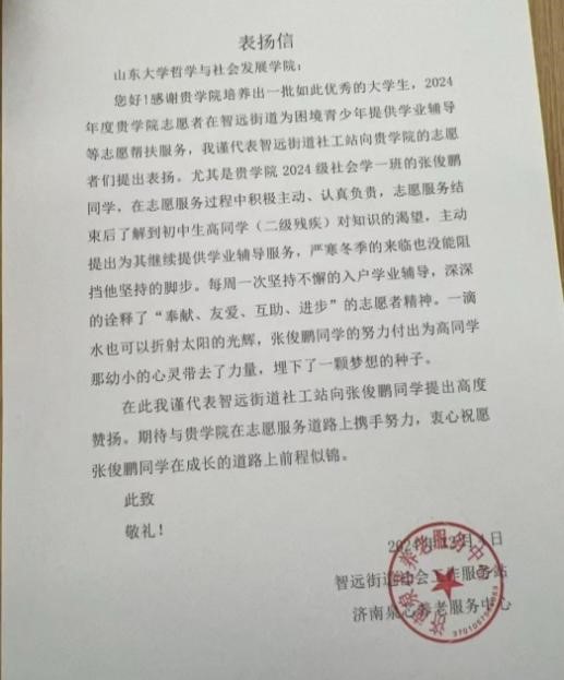 近日,beat365英国官方网站收到一封来自智远街道社会工作服务站的表扬信,信中对学院 2024 级社会学一班张俊鹏在志愿服务中的突出表现给予高度赞扬,同时对学院在人才培养方面的成果表示肯定。