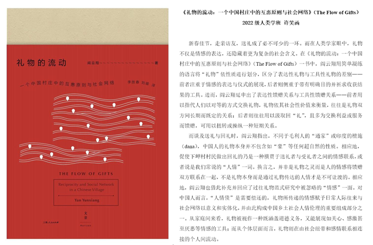 活动参与者许笑函同学在春节中体会到了礼物流动与人类学的关系,“逢年过节的礼物流动,让我们得以管窥当代中国的人情关系运作模式。在我看来,人类学民族志中所呈现的观察、交流与记录的工作不仅可以呈现一地或一事所蕴含的文化意蕴,更可以帮助我们了解未知、反思已知,收获新的观察视角和思考方式。”