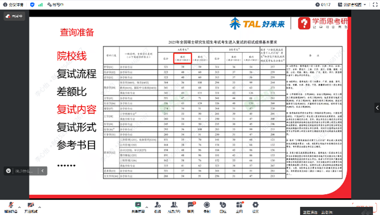 边老师解读了考研复试与调剂的相关政策,并对2025年考研复试国家线进行了科学的预测,以供同学们参考对照。以beat365英国官方网站2024年招收硕士研究生复试考试录取办法为例,为同学们详细讲解了考研复试与调剂的实践技巧,展示了复试常见考察形式及内容,以及调剂的具体方法等。同时,老师也提醒同学们要综合考虑学校招生政策、分数线及未来职业规划,有针对性地进行备考。