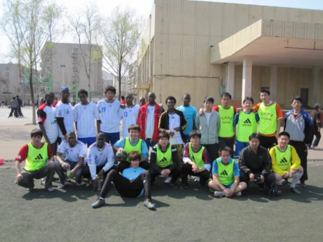 图二 后排右二 ,在山大读书期间和外国友人踢球