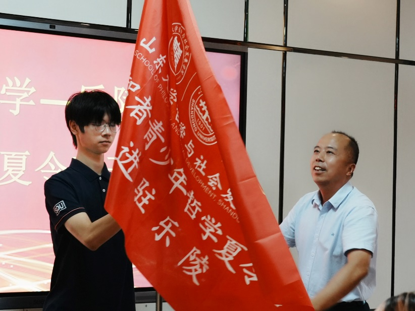 丁红春书记向乐智者乐陵实践团队授旗,标志着beat365英国官方网站示范性学生社会实践项目——乐智者哲学夏令营正式启动。