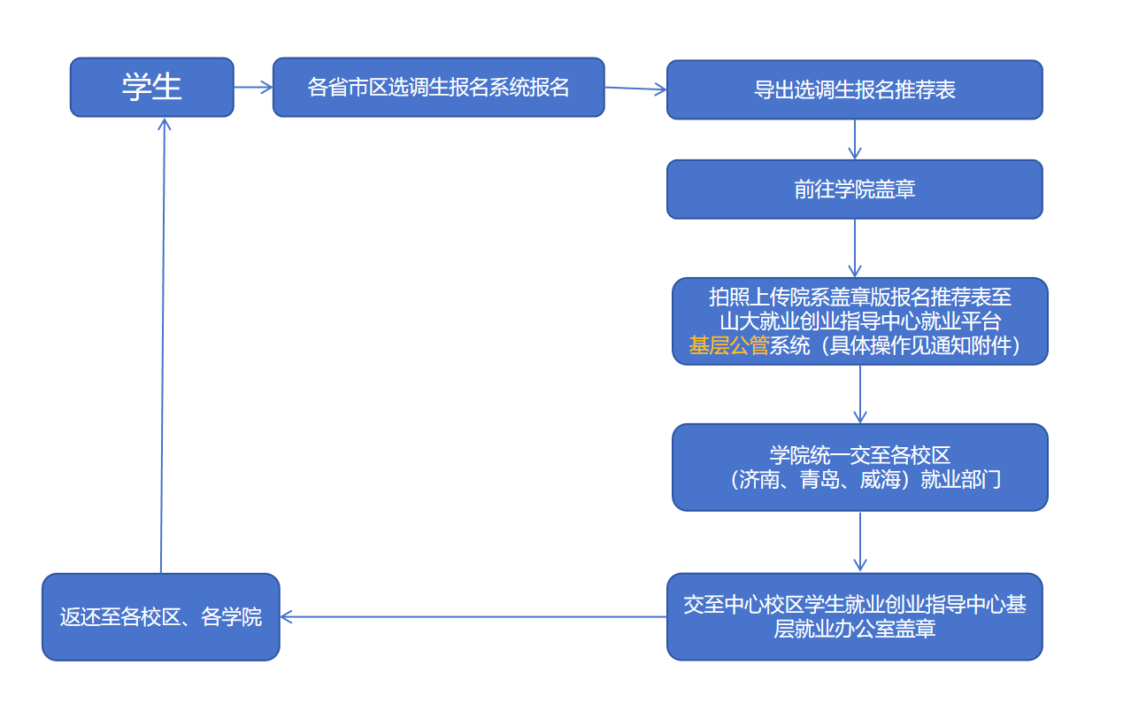3.济南校区各学院统一收齐纸质版《报名推荐登记表》,于10月31日前送至中心校区就业中心基层就业管理办公室(17-18号楼西连廊二楼202)。