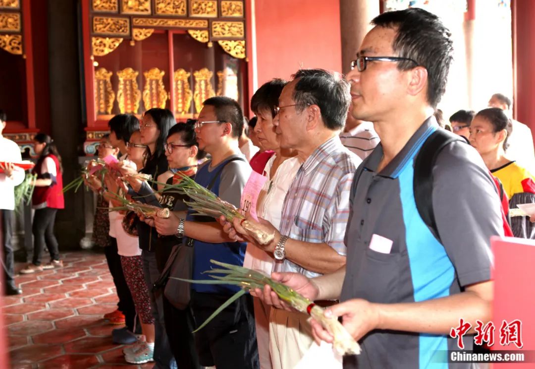 台北市孔庙举办“高中登科·考生祈福”典礼,考生及家长在大成殿内持葱(寓意聪明智慧),礼敬至圣先师。