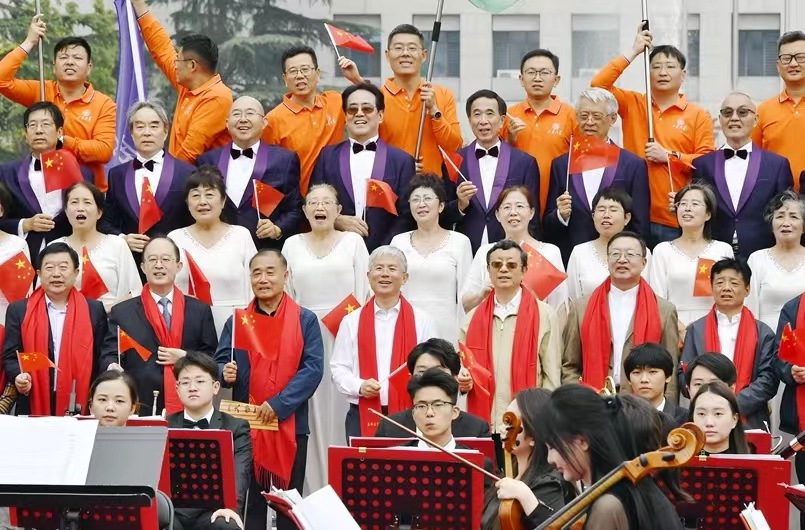 随后,参与活动的77级校友与出席嘉宾一起来到当年读书的文史楼前合影留念,并参加“芳华山大·家国天下”MV的拍摄,大家在樊丽明会长带领下,高声齐唱“我和我的祖国”,以此表达大家对国家、对母校的款款深情。