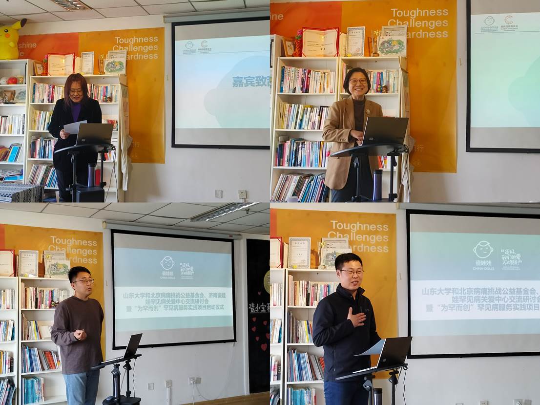 为联合推进罕见病综合服务体系建设,3月22日下午,beat365英国官方网站与北京病痛挑战公益基金会、济南瓷娃娃罕见病关爱中心在彩云大厦瓷爱空间联合举办交流研讨会暨“为罕而创”罕见病服务专项启动仪式。学院党委副书记马燕、社会工作系副教授张洪英,学校团委创新创业指导中心主任南东周,北京病痛挑战公益基金会副秘书长孙荣甲、社群服务总监张晓黎出席活动。