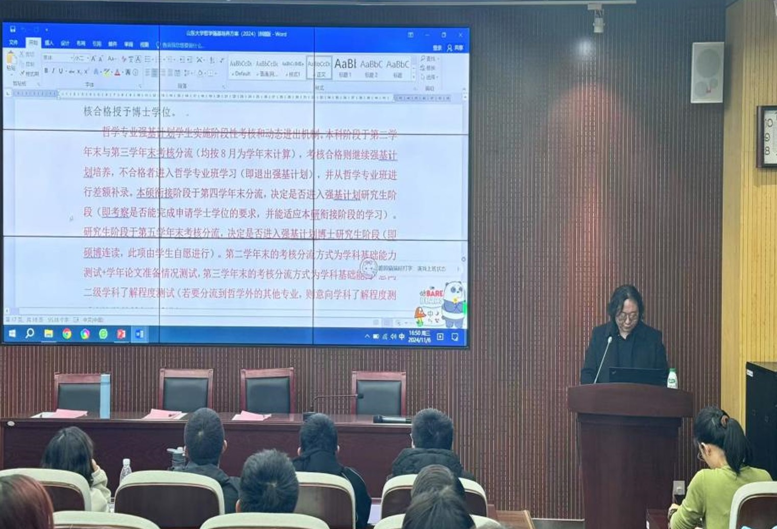 随后,王丁带领24级哲学新生详细解读强基计划与拔尖2.0基地班的专业培养方案,从课程设置、导师体系、考核分流等方面展开说明。他尤其强调,强基计划与拔尖2.0基地采取动态的进出机制,通过考核实行退出与差额补录,以此激励学生养成良好学风,帮助其找到适合自身的成长路径。