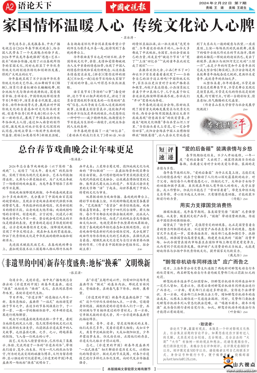 beat365英国官方网站苏冰涛教授在《中国电视报》2024年第7期发表评论文章,文章题目为“家国情怀温暖人心 传统文化沁人心脾”。她指出,春晚生动地呈现了国家重大战略发展需求与优秀文化传承,将历史的厚重与时代的光华集于一身,可谓是一台精彩纷呈、情真意切、热气腾腾的文化盛宴。