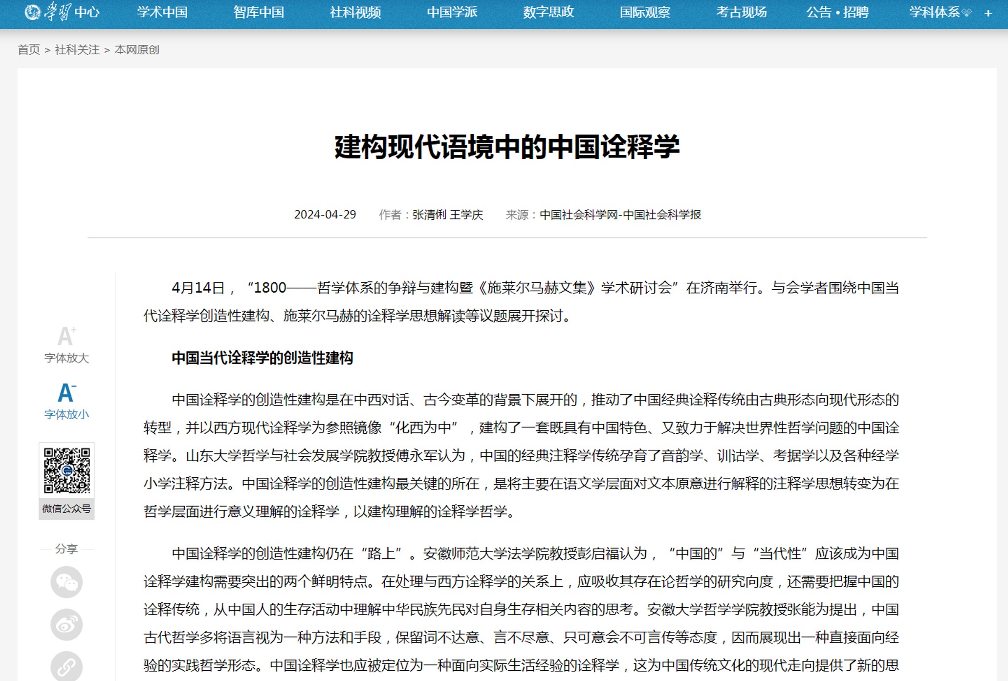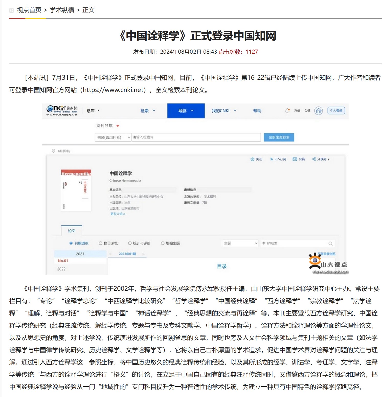 山大视点首页学术纵横栏目报道《中国诠释学》正式登录中国知网