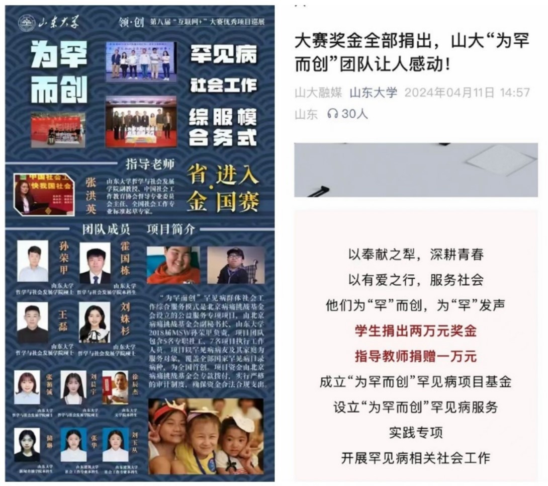 beat365英国官方网站公众号报道beat365英国官方网站“为罕而创”团队。由beat365英国官方网站张洪英副教授指导的“为罕而创”罕见病服务实践专项团队,获得“互联网+”大赛省级金奖和国家级铜奖,团队成员将获得的两万元奖金全部捐出,用于开展持续罕见病工作,张洪英老师自愿捐赠一万元共同成立“为罕而创”罕见病项目基金。同时,团队成员设立“为罕而创”罕见病服务实践专项,开展罕见病相关社会工作,为一个个罕见病家庭带去希望。