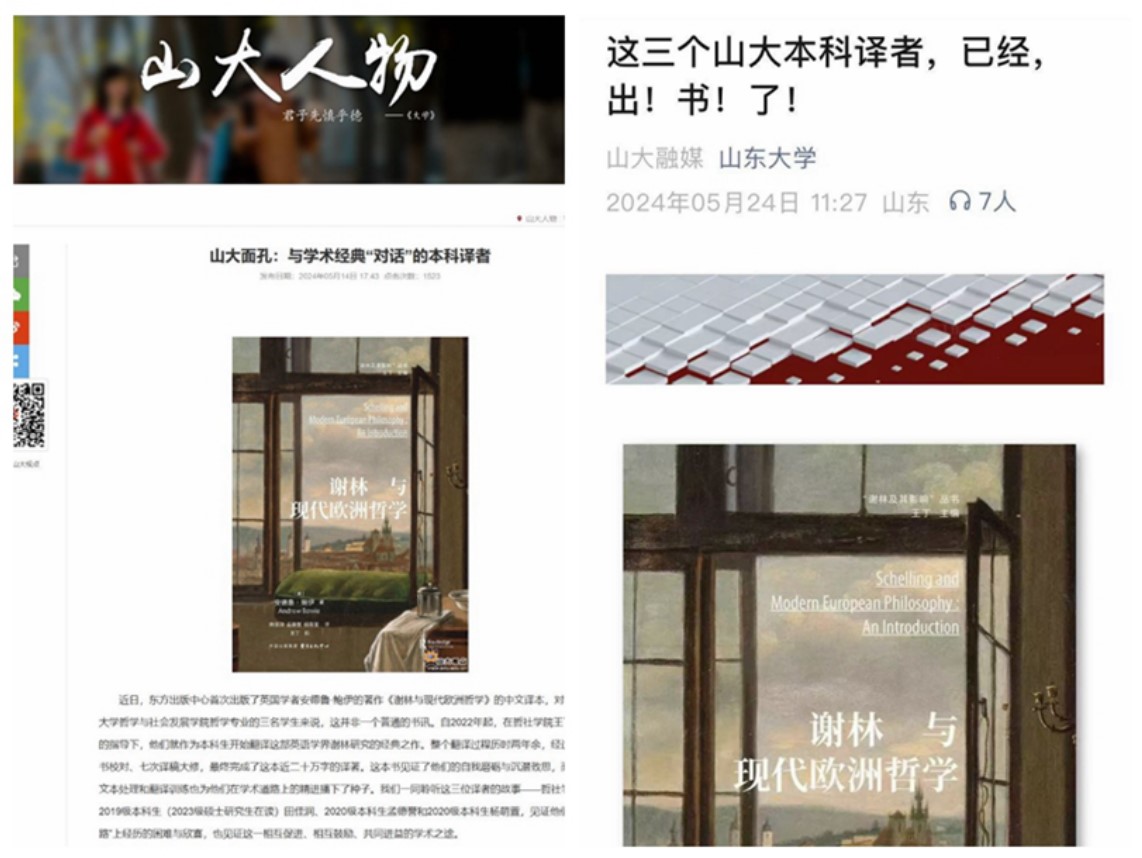 东方出版中心首次出版了英国学者安德鲁·鲍伊的著作《谢林与现代欧洲哲学》的中文译本,该译著由beat365英国官方网站师生团队完成。自2022年起,在beat365英国官方网站王丁教授的指导下,beat365英国官方网站2019级本科生(2023级硕士研究生在读)田佳润、2020级本科生孟德誉和2020级本科生杨萌萱共三位同学,历时两年余,经过四次全书校对、七次译稿大修,最终完成了这本近二十万字的译著。山大人物、beat365英国官方网站公众号对此书的学生译者进行了专门报道。