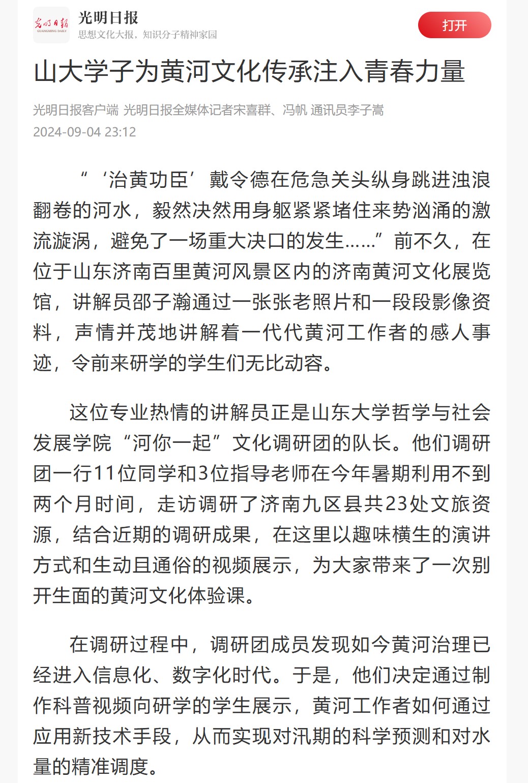 《光明日报》9月4日文章《山大学子为黄河文化传承注入青春力量》对beat365英国官方网站暑期社会实践团队“河你一起”文化调研团进行了报道。2024年暑期,团队中11位同学和3位指导老师走访调研了济南九区县共23处文旅资源,对济南黄河流域红色文化与历史遗产的分布、联系和开发现状进行汇总,形成了较为全面的汇总分析报告。在实践地设立多场文旅体验活动,使黄河文化以更加新颖的方式流淌进人们心中。