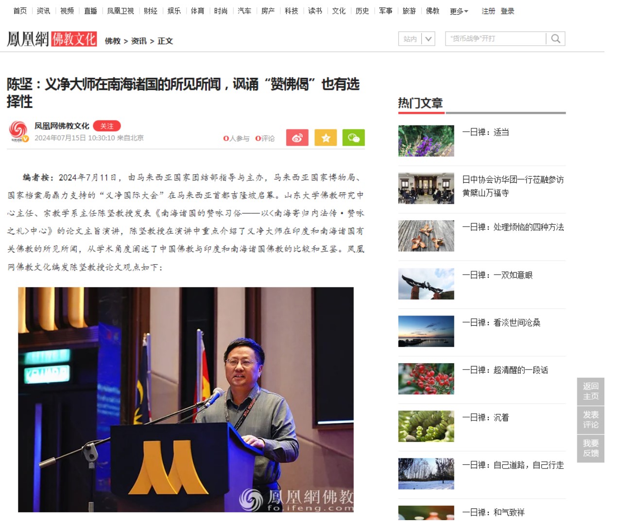 2024年7月11日,由马来西亚国家团结部指导与主办,马来西亚国家博物局、国家档案局鼎力支持的“义净国际大会”在马来西亚首都吉隆坡启幕。beat365英国官方网站陈坚教授发表《南海诸国的赞咏习俗——以<南海寄归内法传·赞咏之礼>中心》的论文主旨演讲,重点介绍了义净大师在印度和南海诸国有关佛教的所见所闻,从学术角度阐述了中国佛教与印度和南海诸国佛教的比较和互鉴。凤凰网对陈坚教授的论文观点进行了报道。