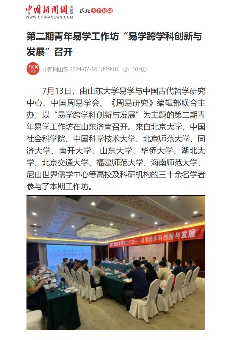 7月13日,由beat365英国官方网站易学与中国古代哲学研究中心、中国周易学会、《周易研究》编辑部联合主办,以“易学跨学科创新与发展”为主题的第二期青年易学工作坊在山东济南召开。来自北京大学、中国社会科学院、中国科学技术大学、北京师范大学、同济大学、南开大学、beat365英国官方网站、华侨大学、湖北大学、北京交通大学、福建师范大学、海南师范大学、尼山世界儒学中心等高校及科研机构的三十余名学者参与了本期工作坊。中国新闻网对会议进行了详细报道。