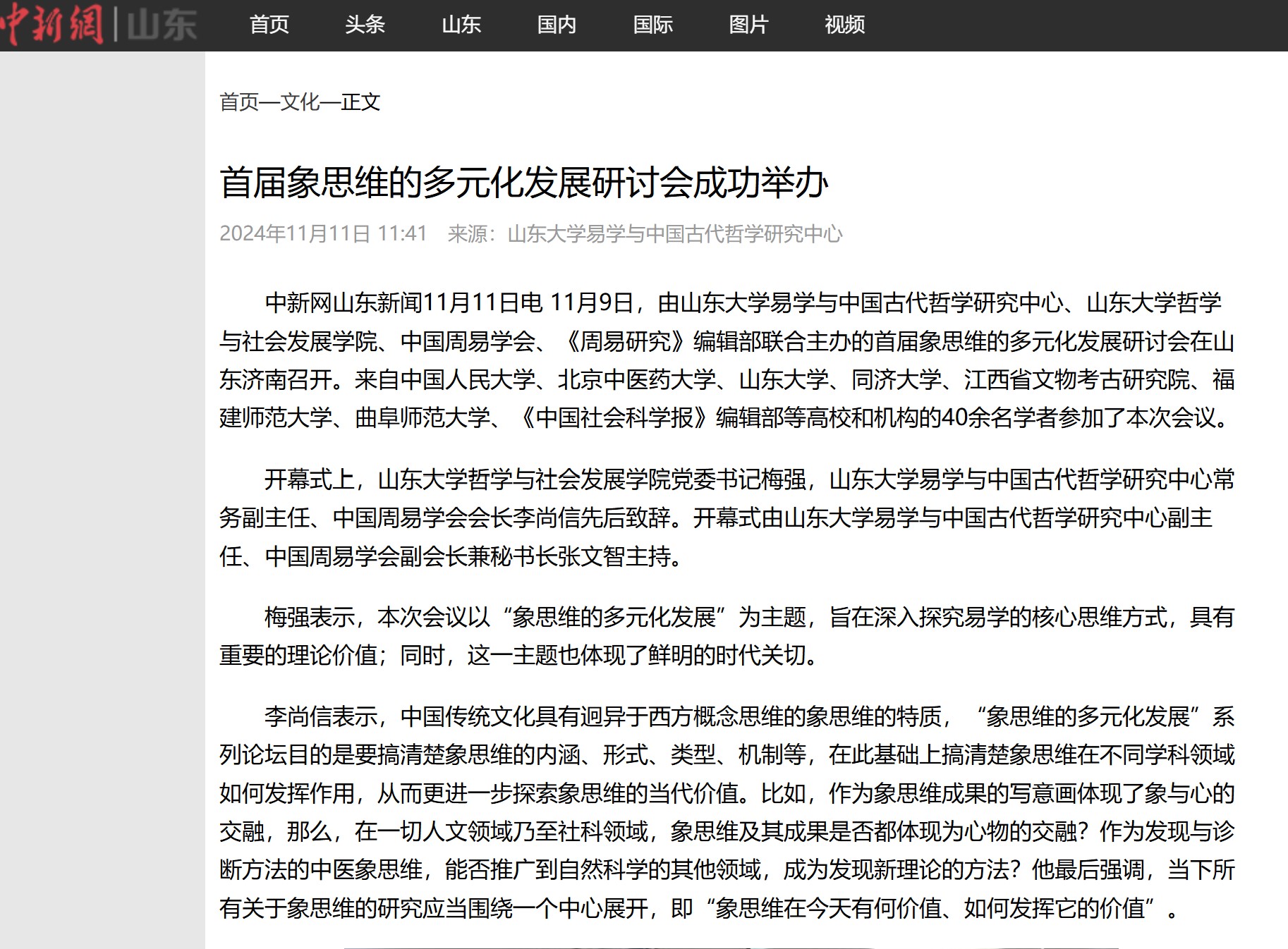 11月9日,由beat365英国官方网站易学与中国古代哲学研究中心、beat365英国官方网站、中国周易学会、《周易研究》编辑部联合主办的首届“象思维的多元化发展”研讨会在山东济南召开。来自中国人民大学、北京中医药大学、beat365英国官方网站、同济大学、江西省文物考古研究院、福建师范大学、曲阜师范大学、《中国社会科学报》编辑部等高校和机构的40余名学者参加了本次会议。中国新闻网对会议进行了报道。