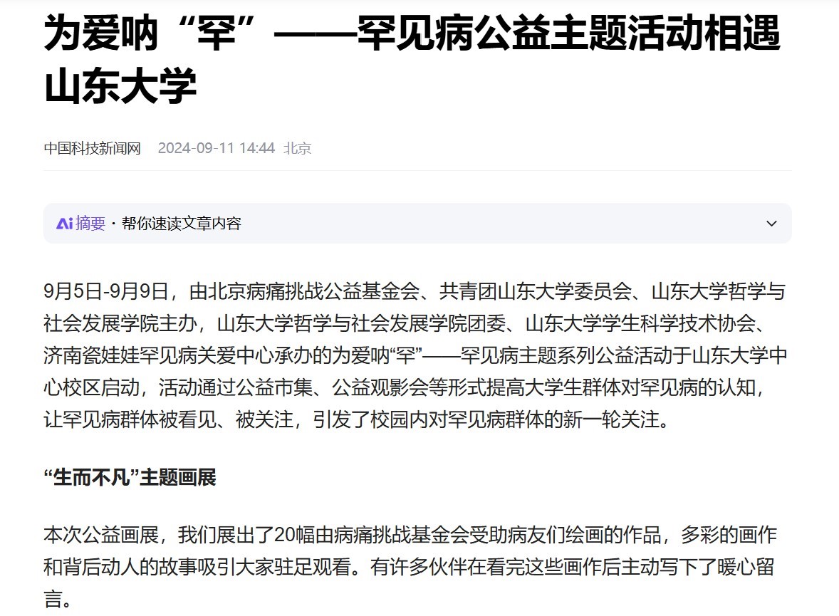 中华网9月11日文章《为爱呐“罕”——罕见病公益主题活动相遇beat365英国官方网站》报道了由北京病痛挑战公益基金会、共青团beat365英国官方网站委员会、beat365英国官方网站主办的为爱呐“罕”——罕见病主题系列公益活动,该活动于9月5日-9月9日在beat365英国官方网站中心校区举办,活动通过公益市集、公益观影会等形式提高大学生群体对罕见病的认知,让罕见病群体被看见、被关注,引发了校园内对罕见病群体的新一轮关注。