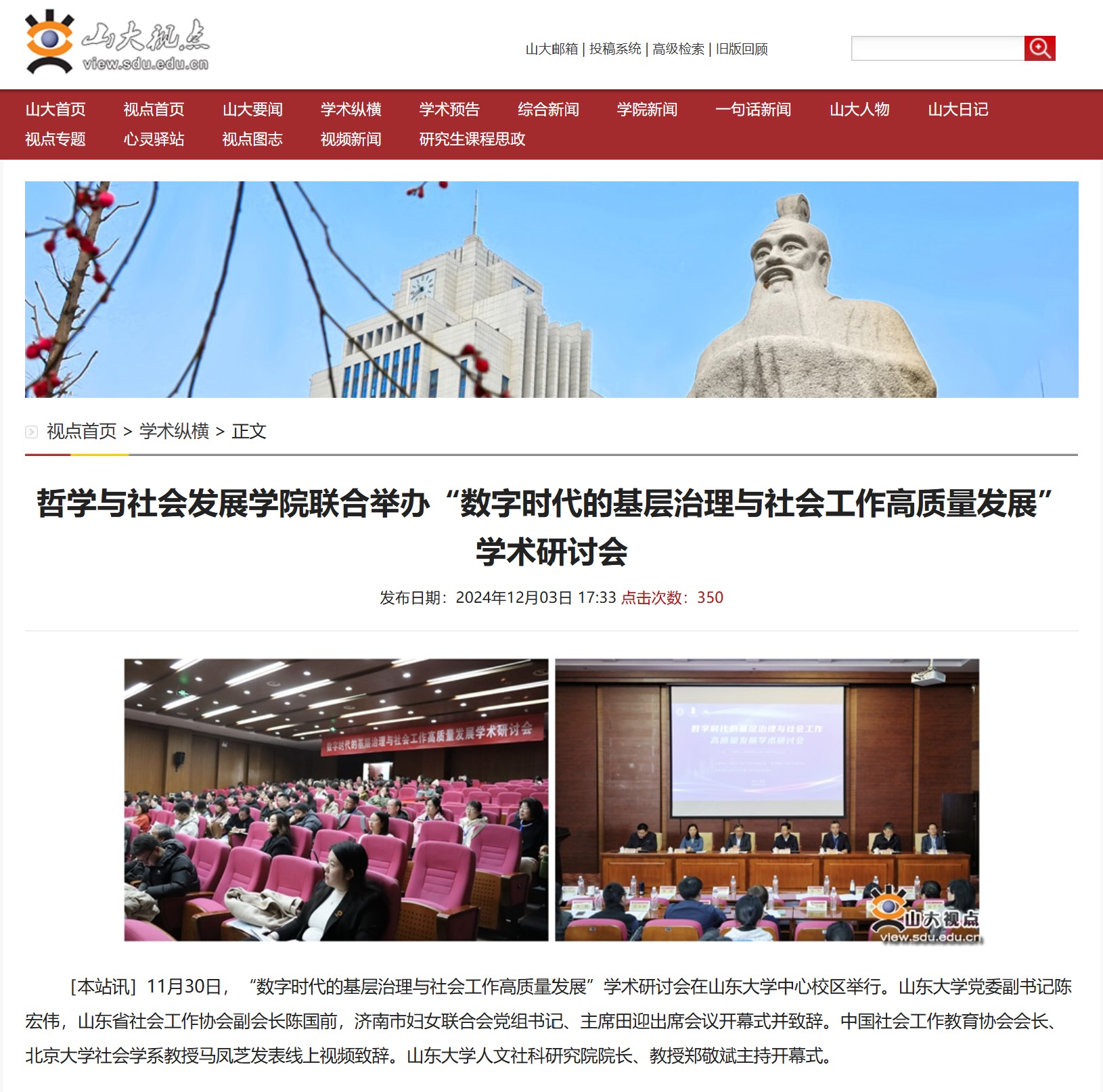 山大视点首页学术纵横栏目报道“数字时代的基层治理与社会工作高质量发展”学术研讨会