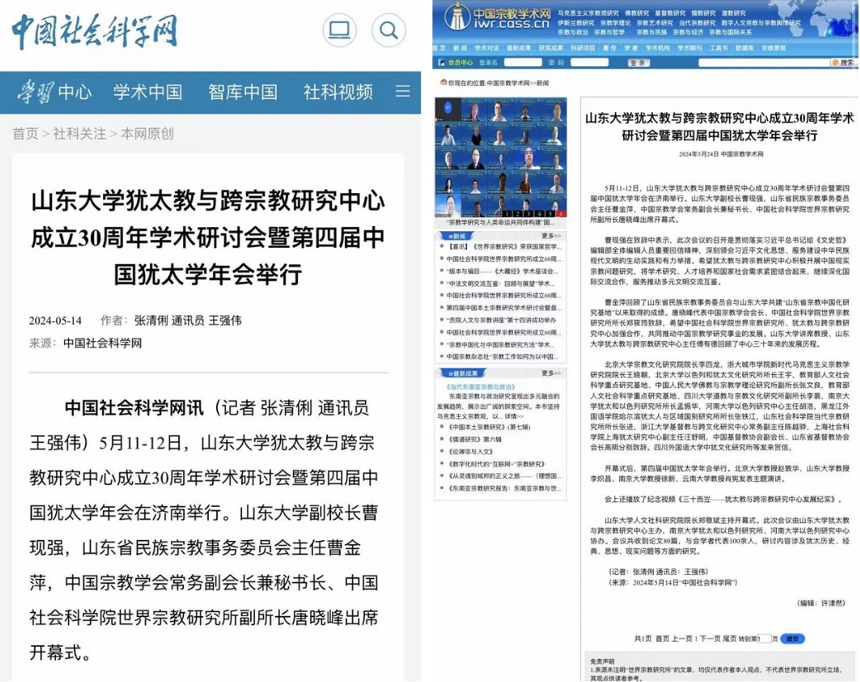 中国社会科学网、中国宗教学术网报道犹太教与跨宗教研究中心成立30周年学术研讨会暨第四届中国犹太学年会