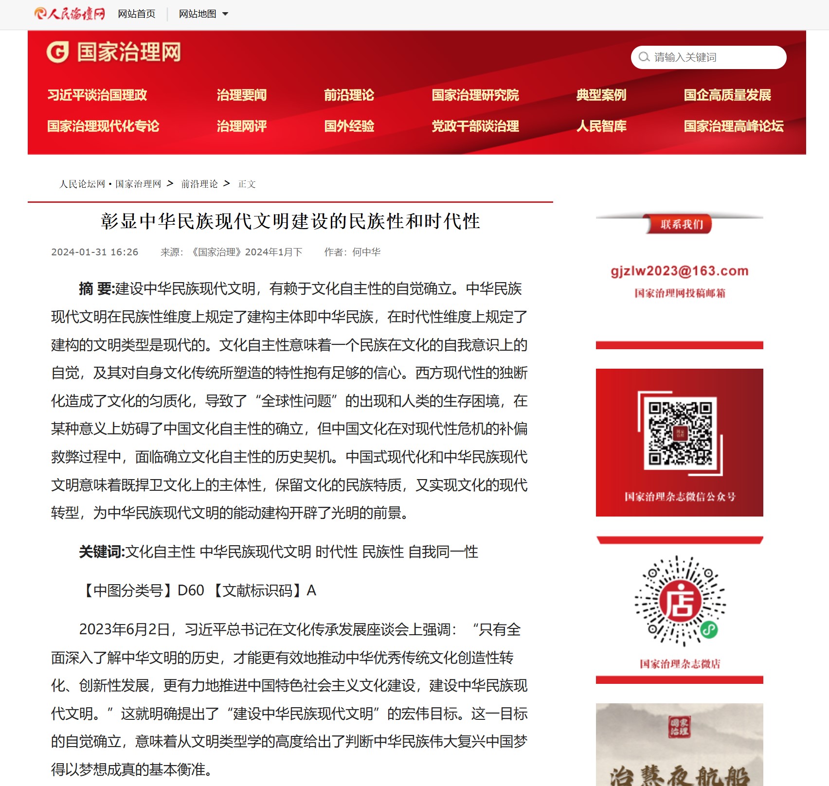 《国家治理》刊发何中华教授理论文章《彰显中华民族现代文明建设的民族性和时代性》