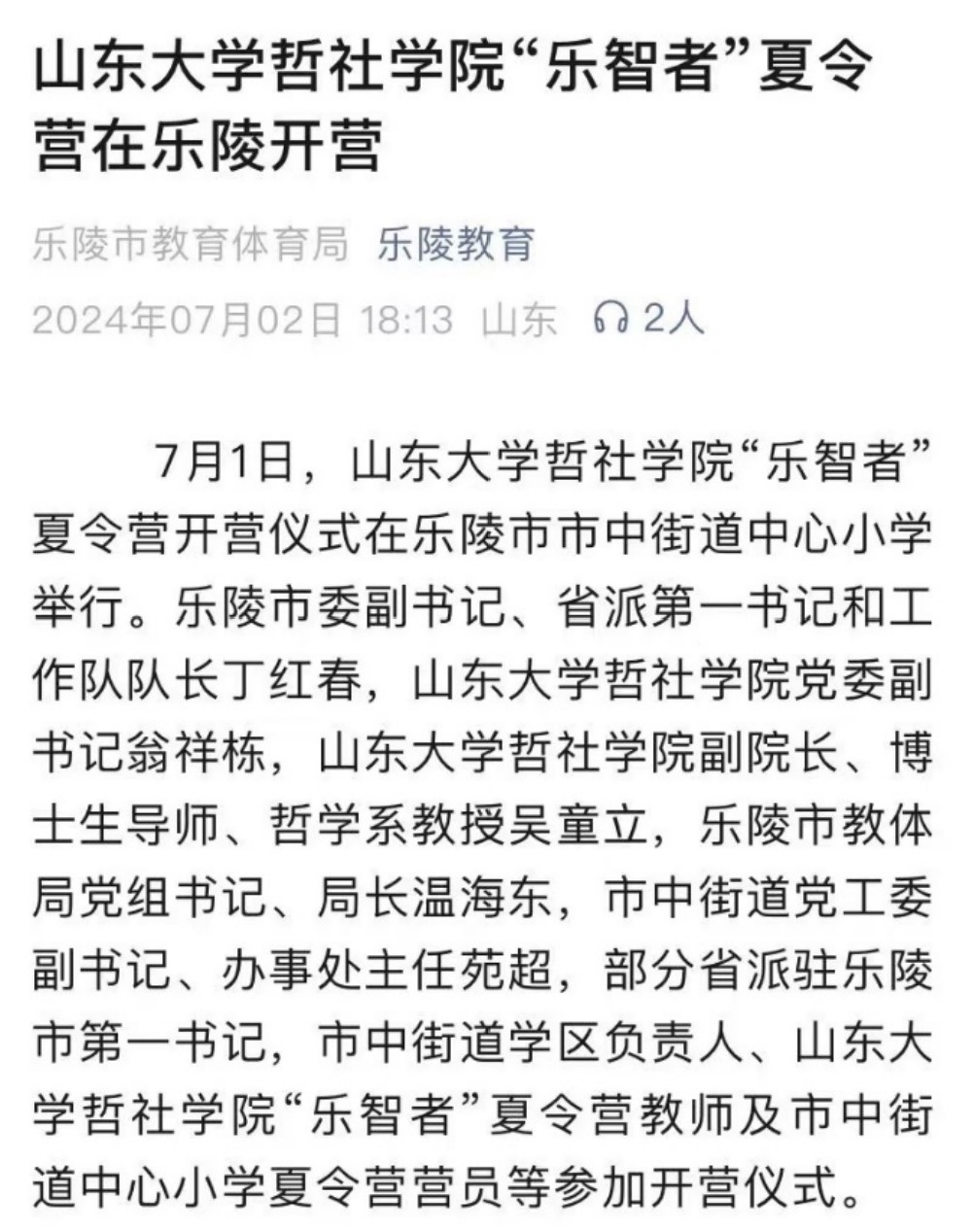乐陵市教育体育局官方公众号报道“乐智者”夏令营