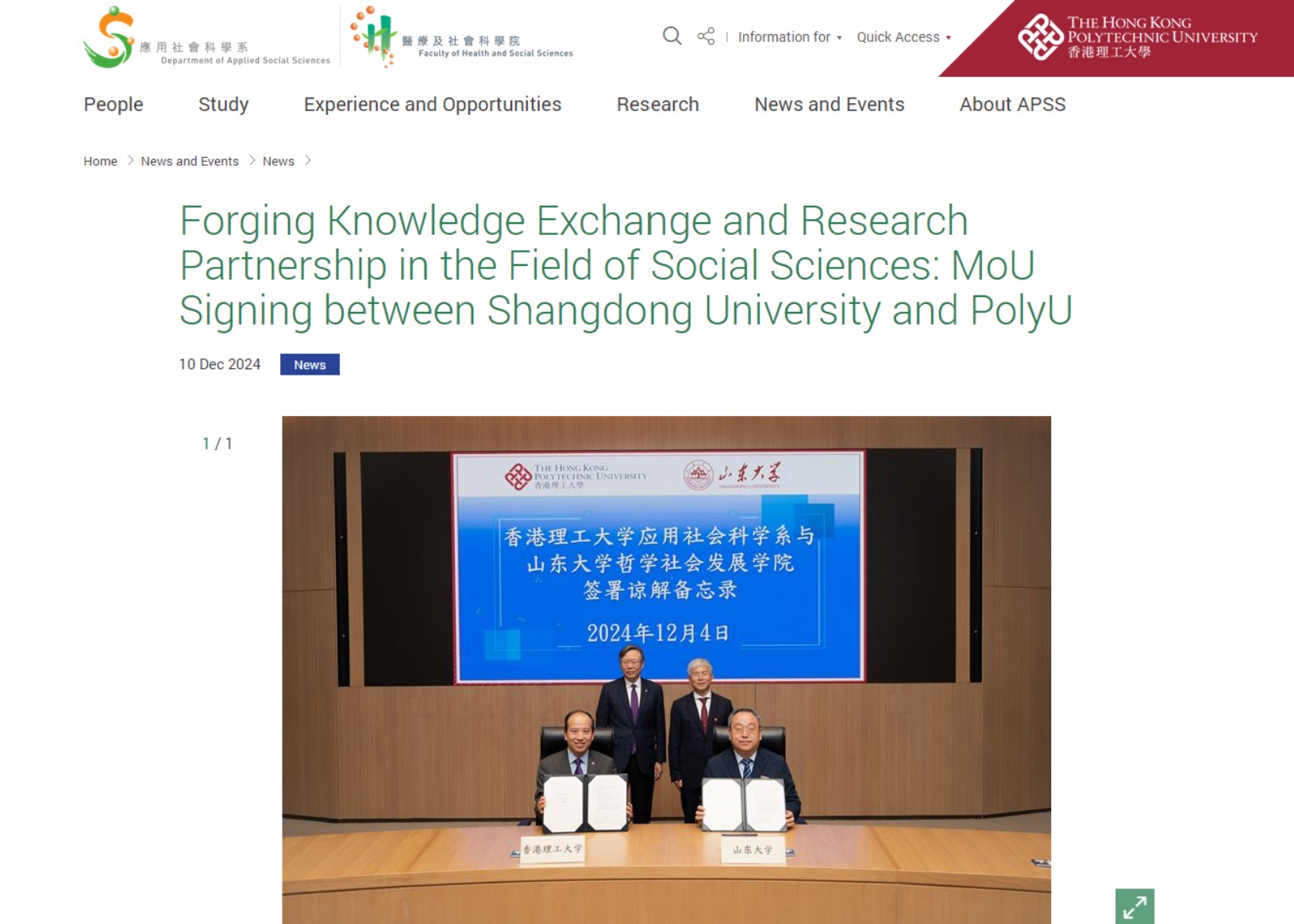 12月4日下午,李术才校长率团访问香港理工大学,与校长滕锦光、副校长赵汝恒进行会谈。在双方校长李术才和滕锦光的共同见证下,双方签署了《香港理工大学应用社会科学系与beat365英国官方网站谅解备忘录》。根据协议,双方计划在社会工作专业人才培养、合办学术会议以及联合研究机构建设等领域开展深入合作。香港理工大学应用社会科学系网站对此进行了报道。