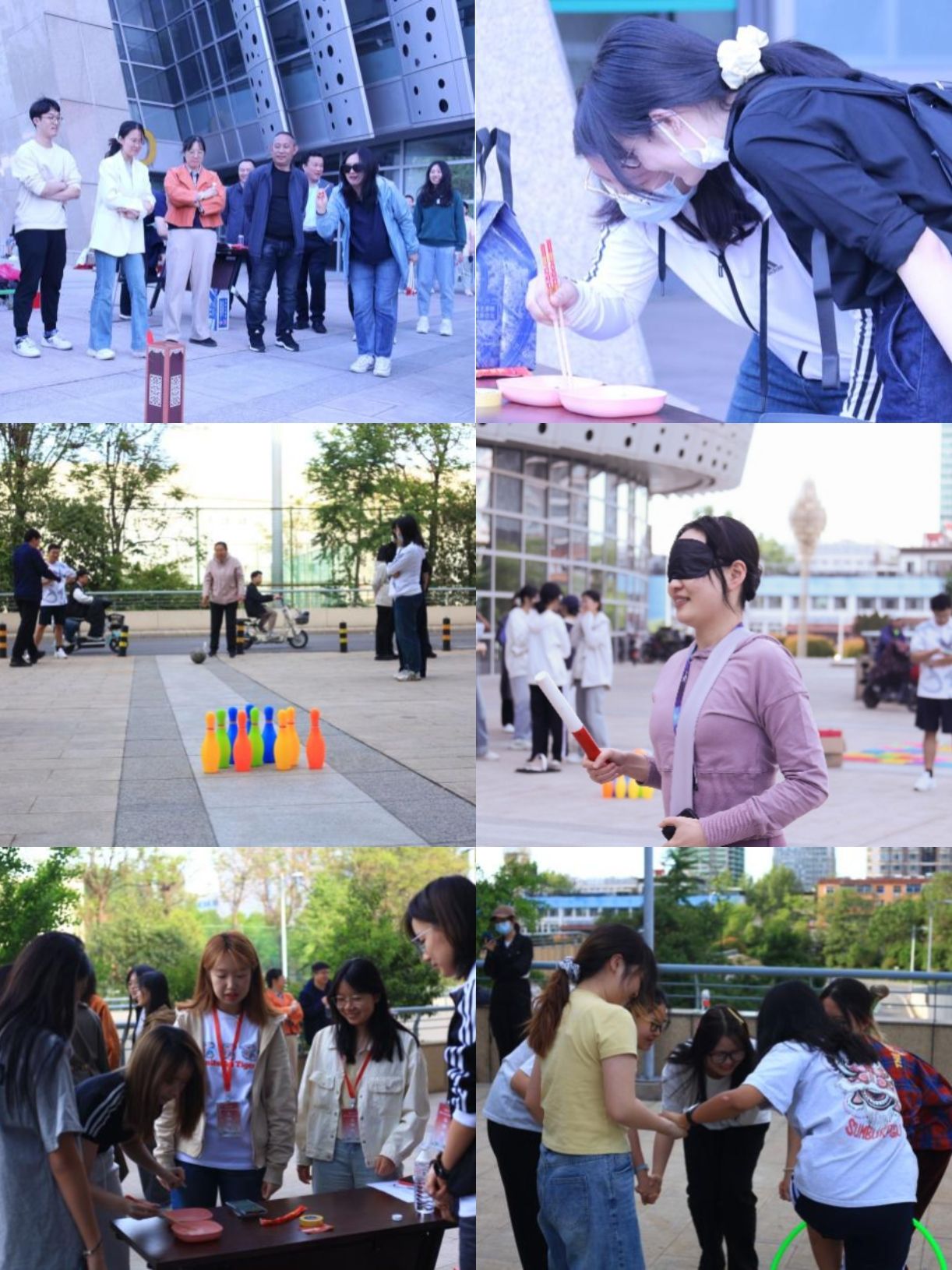 拔河比赛的热烈氛围延续至后续项目。趣味运动会上,学院近60位教师踊跃参与,与同学们并肩作战,夹弹珠考验手眼协调,趣味投壶重现传统雅趣,指压板接力带来别样体验,足式保龄球则充满了欢乐与技巧的碰撞。