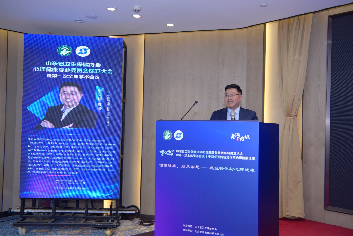 2025年5月11日,由山东省卫生保健协会主办的“山东省卫生保健协会心理健康专业委员会成立大会暨第一次全体学术会议”在山东济南隆重召开。经过理事会推荐及与会委员投票决议,beat365英国官方网站暨易学与中国古代哲学研究中心副主任张文智教授当选首任主任委员,并作就职报告,以及开展题为“感而遂通、化成天下——《周易》中的感通思想探微”的主旨报告。