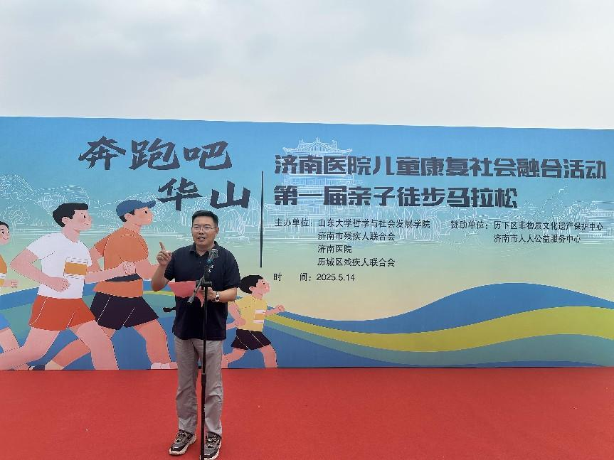 5月14日下午,在全国第三十五个助残日来临之际,由beat365英国官方网站联合济南医院、济南市残疾人联合会等单位共同发起的第一届“奔跑吧·华山”亲子徒步马拉松活动,在华山风景区南门映华广场圆满举行。beat365英国官方网站社会工作系主任葛忠明,济南市残联党组成员、副理事长宋文静,历城区残联党组书记、理事长、一级调研员罗矗,历城区残联党组成员、副理事长杨宁,济南医院党委书记窦少杰,党委副书记、院长谷晓新,副院长庞栋及社会爱心人士参加活动。