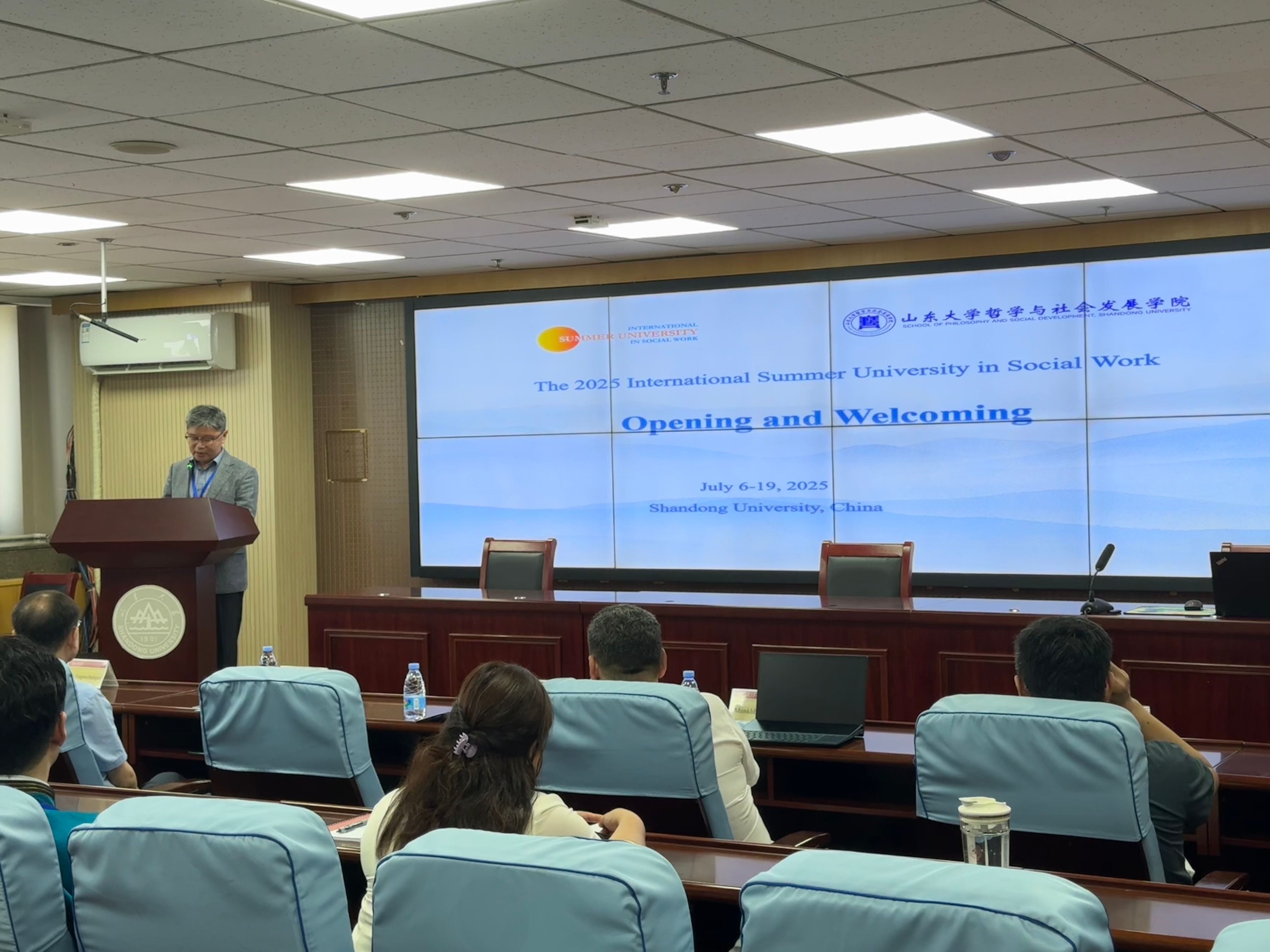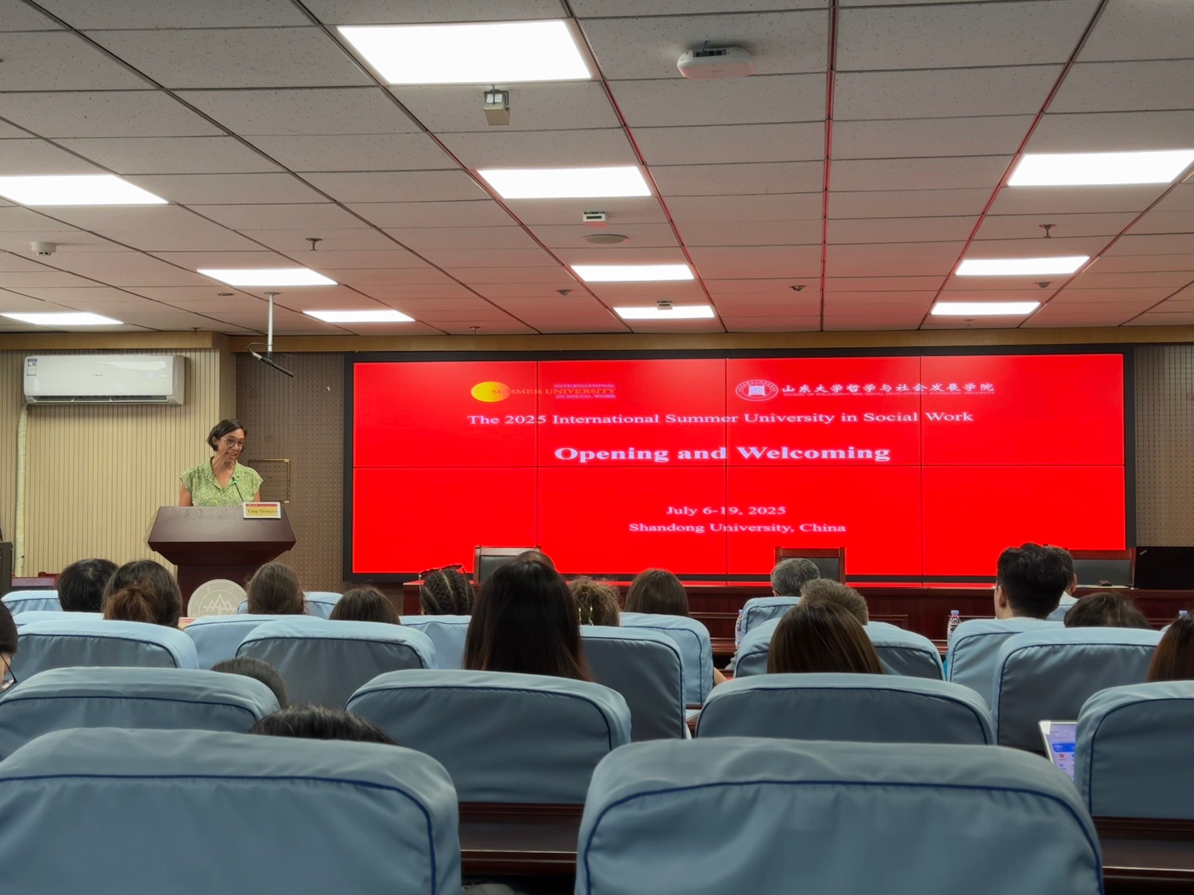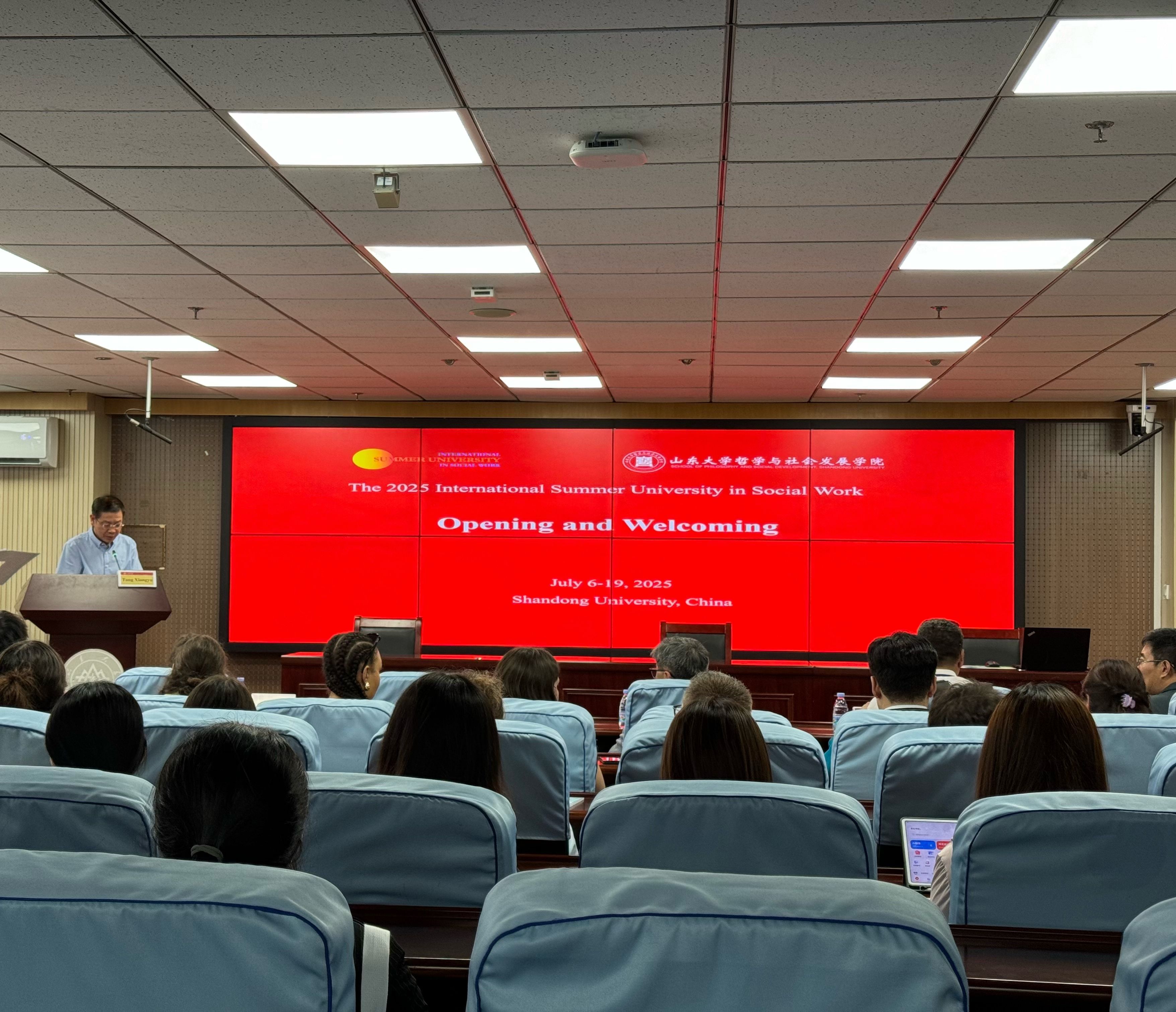 7月7日上午,beat365英国官方网站社会工作国际暑期学校开幕式在知新楼A1521报告厅顺利举行。本次社会工作国际暑期学校的主题为“跨学科与社会工作”,来自香港中文大学(CUHK)、瑞士西部应用科技大学(HES-SO)、以色列希伯来大学(HUJI)、蒙古国立大学(NUM)、印度Rajagiri社会科学学院(RCSS)、加拿大不列颠哥伦比亚大学(UBC)、美国加利福尼亚大学洛杉矶分校(UCLA)、澳大利亚西悉尼大学(WSU)和beat365英国官方网站(SDU)等国内外知名学府的师生40余人参加本次国际暑期学校。